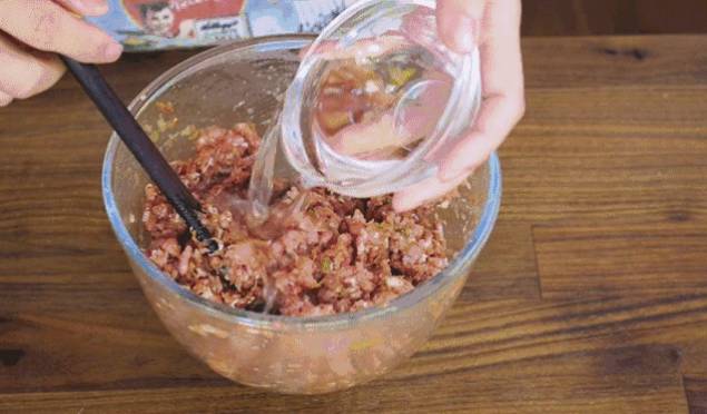 2. 将清水分三次加入肉馅,每次加水后都朝一个方向大力搅拌,水分吸收后再加下一次;注意一定要朝着同一方向分次搅拌哦,这样做出的肉馅才能黏糯成团,好吃弹牙。