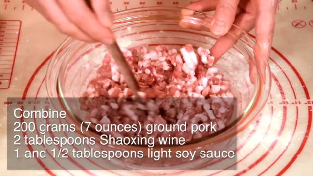 馅 料: 肉末、泡菜、姜末、料酒、酱油、盐适量 做 法 1. 肉末先用两小勺料酒,一小勺酱油腌制一下。