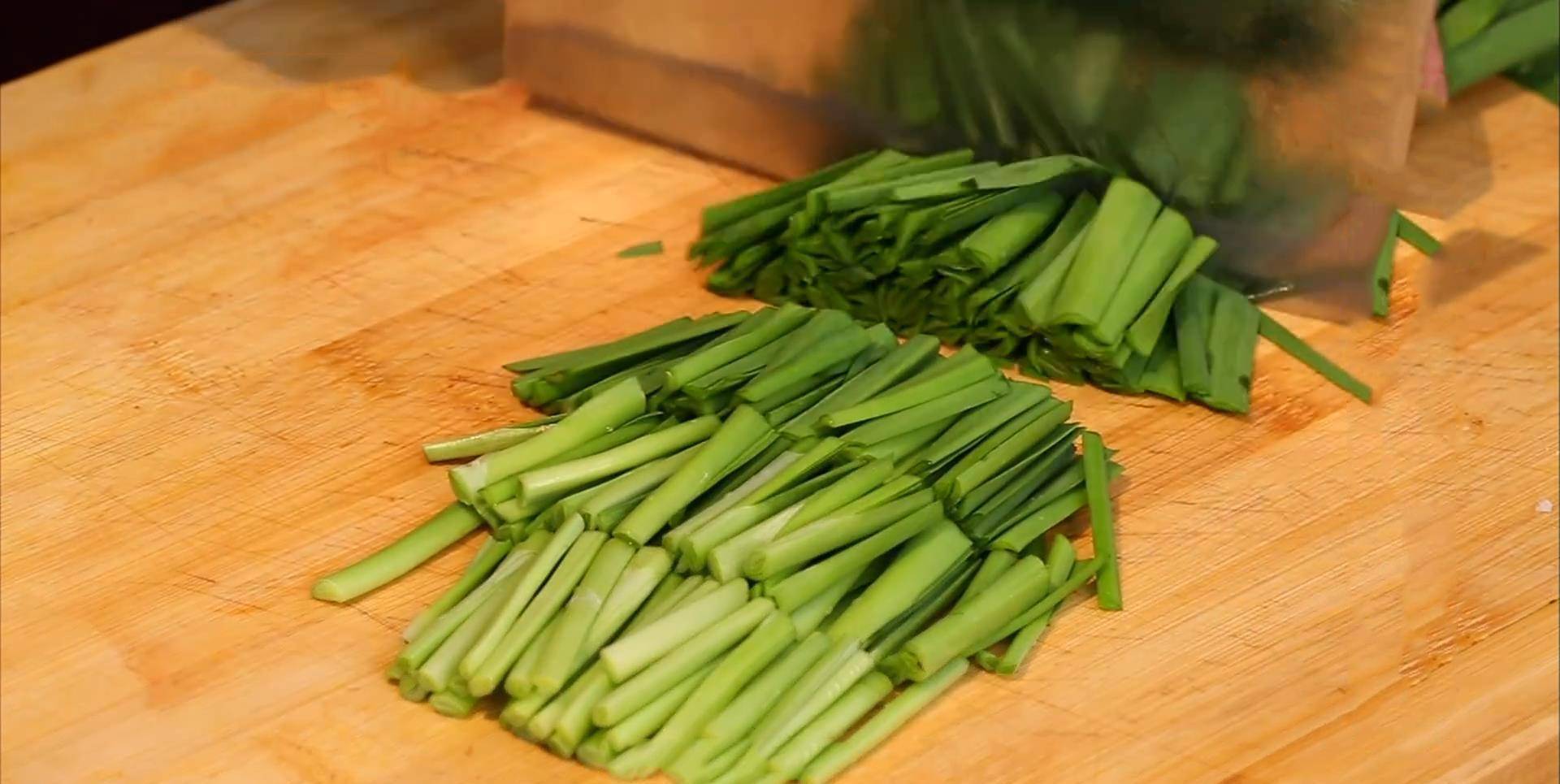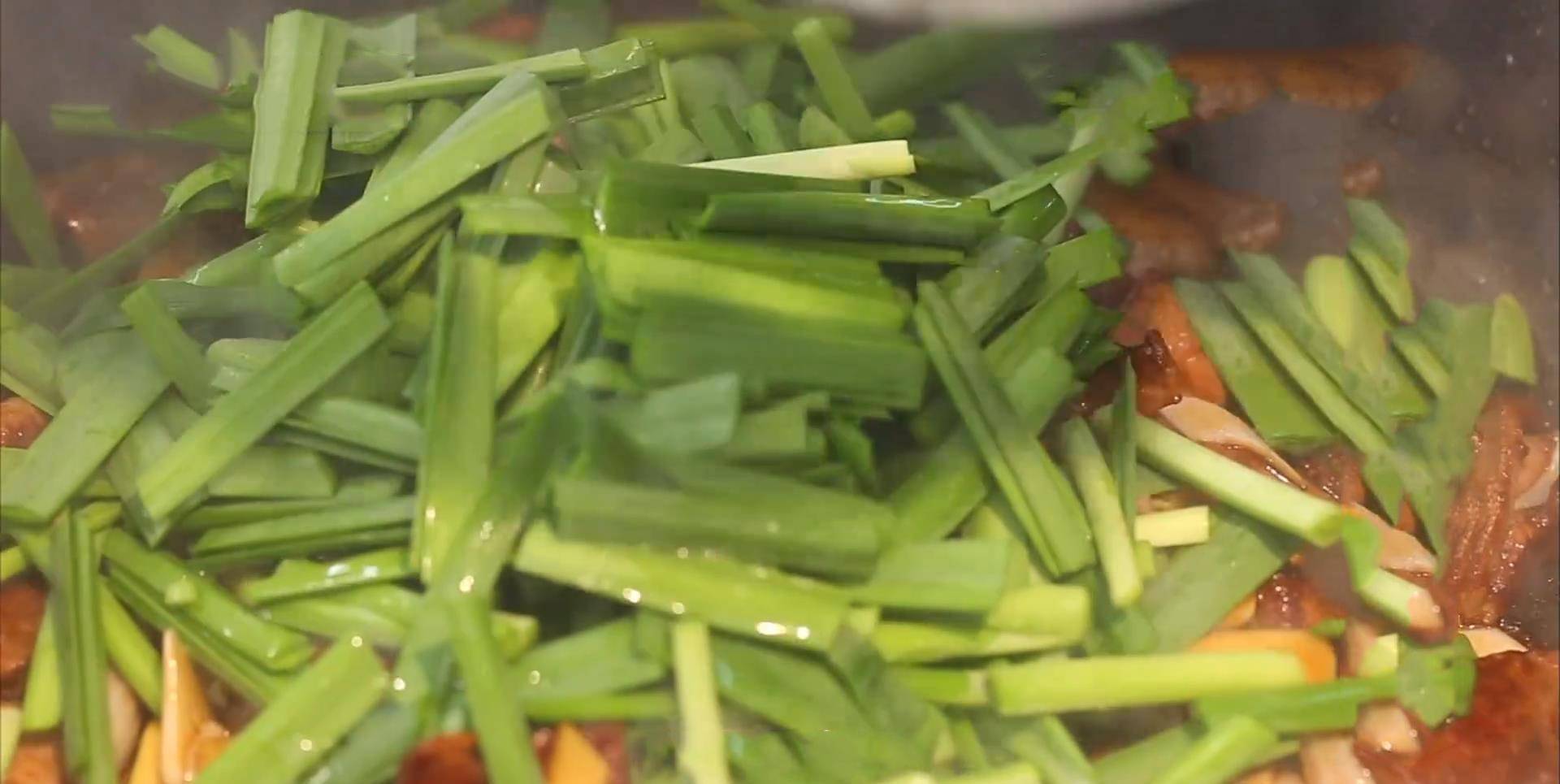 10、倒入碗汁简单翻炒后,下入韭菜快速翻炒。