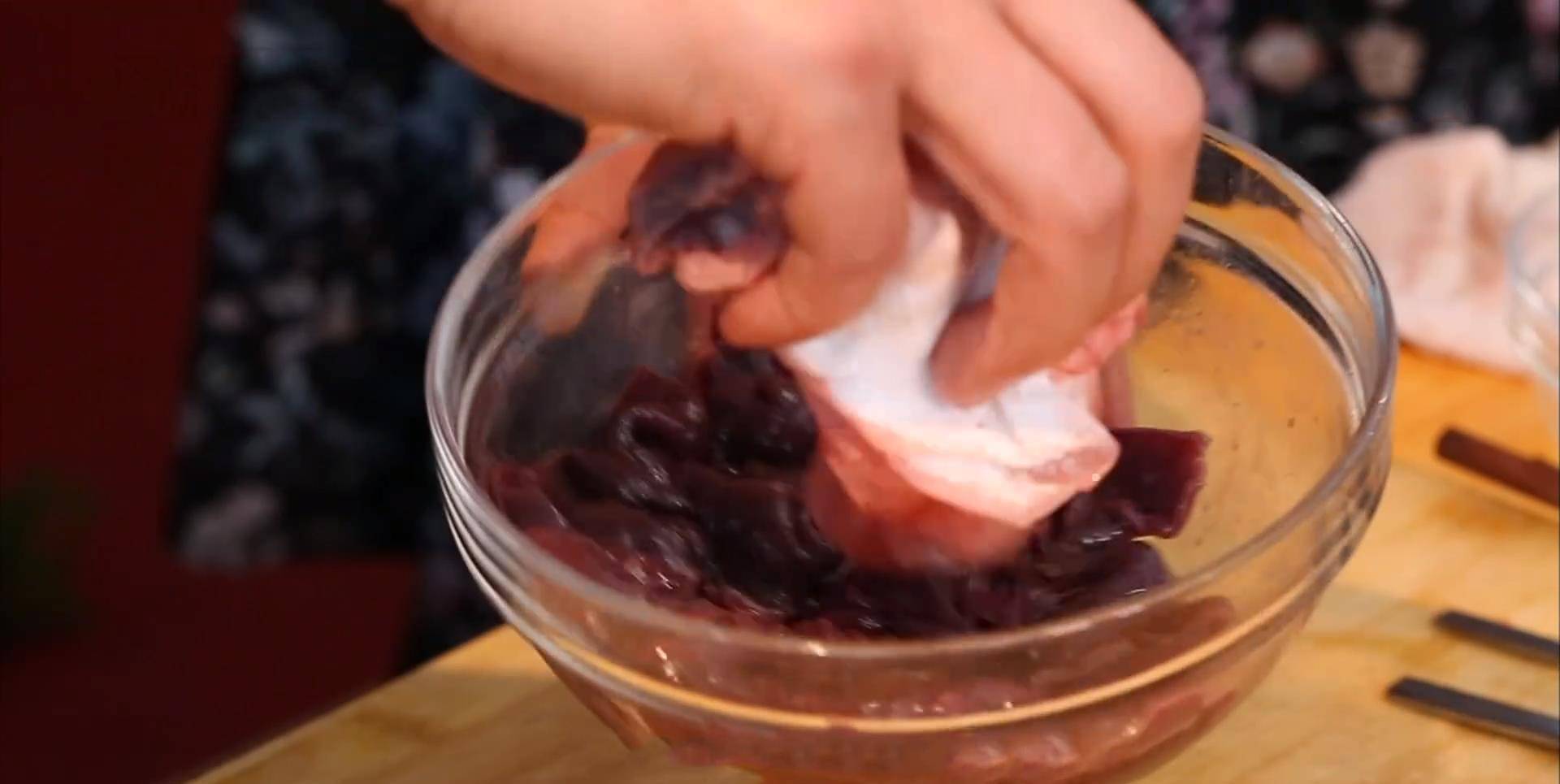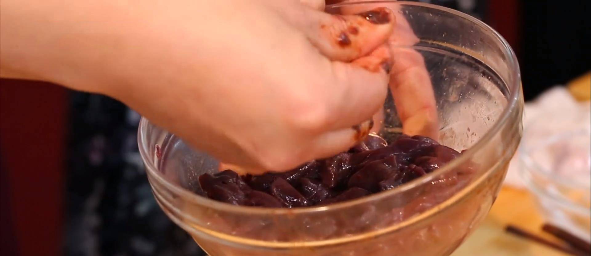 6、然后加入一点干黄酱用手抓均。加入干黄酱,不仅能使猪肝嫩滑,还能去腥增香。