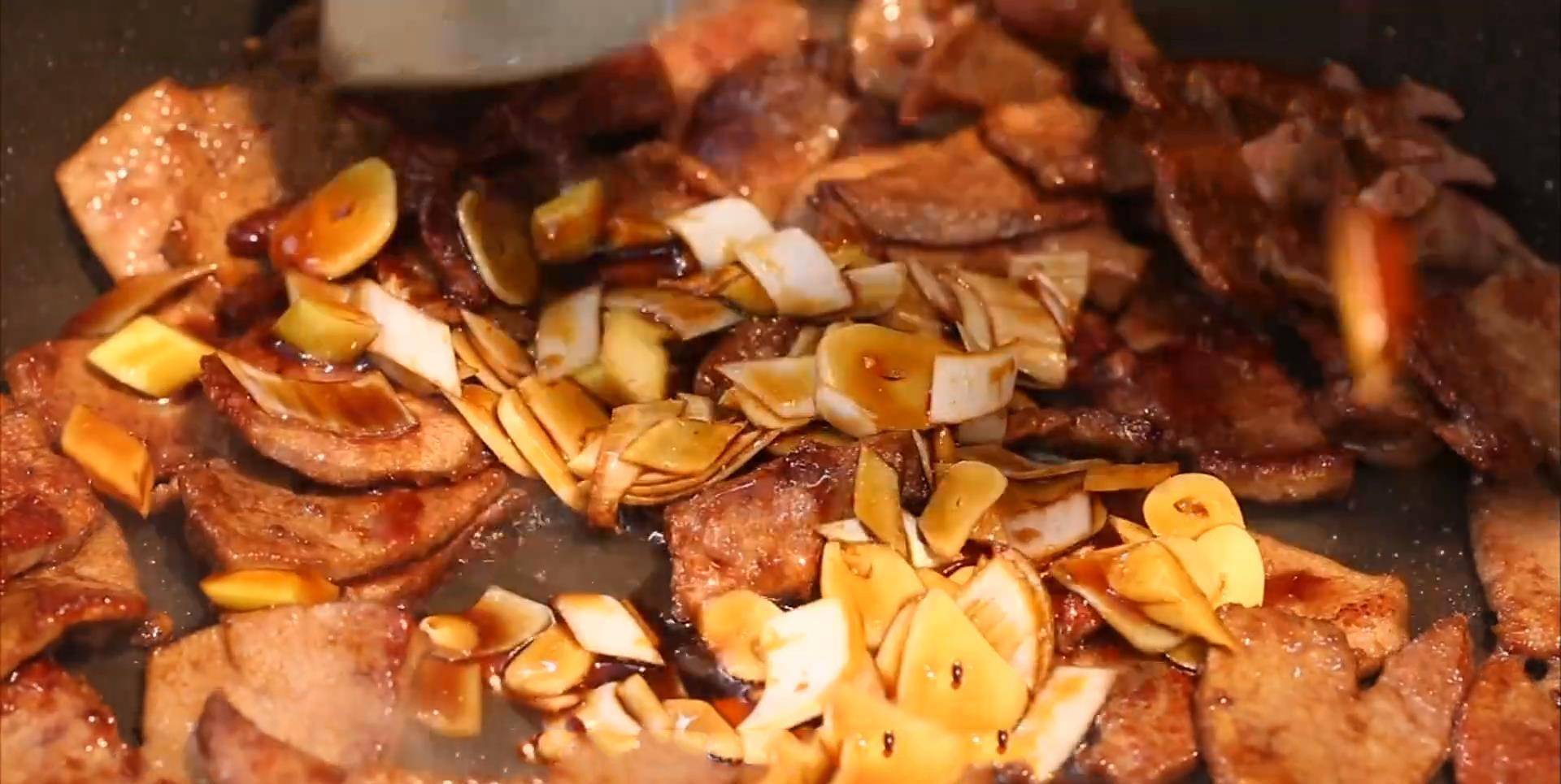 9、猪肝放入淀粉拌均后下锅以后开大火,用筷子快速煸炒至焦黄干香。