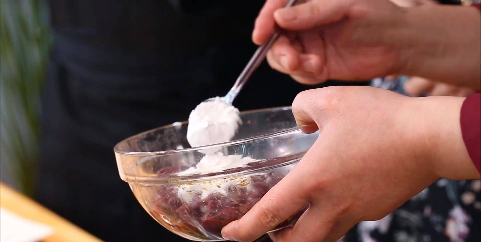 8、猪肝下锅之前加入淀粉拌匀。淀粉要临入锅之前放,因为猪肝里边的含水量极大,早放的话它会把这粉子吃进去了。