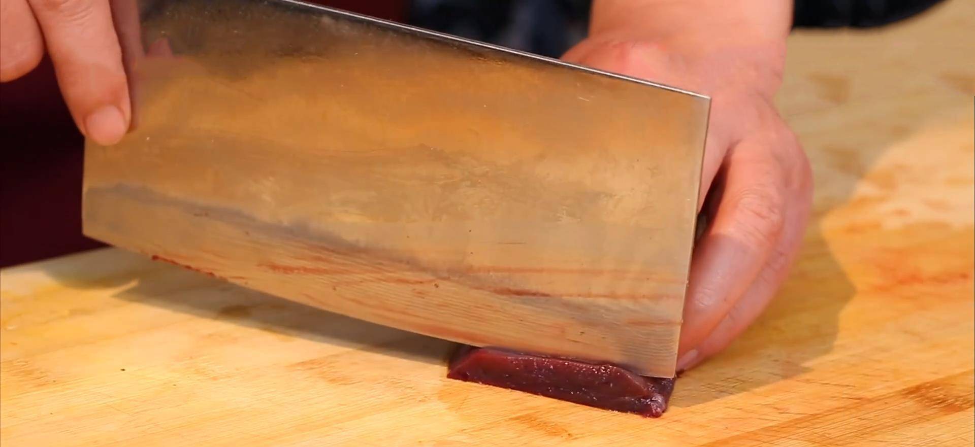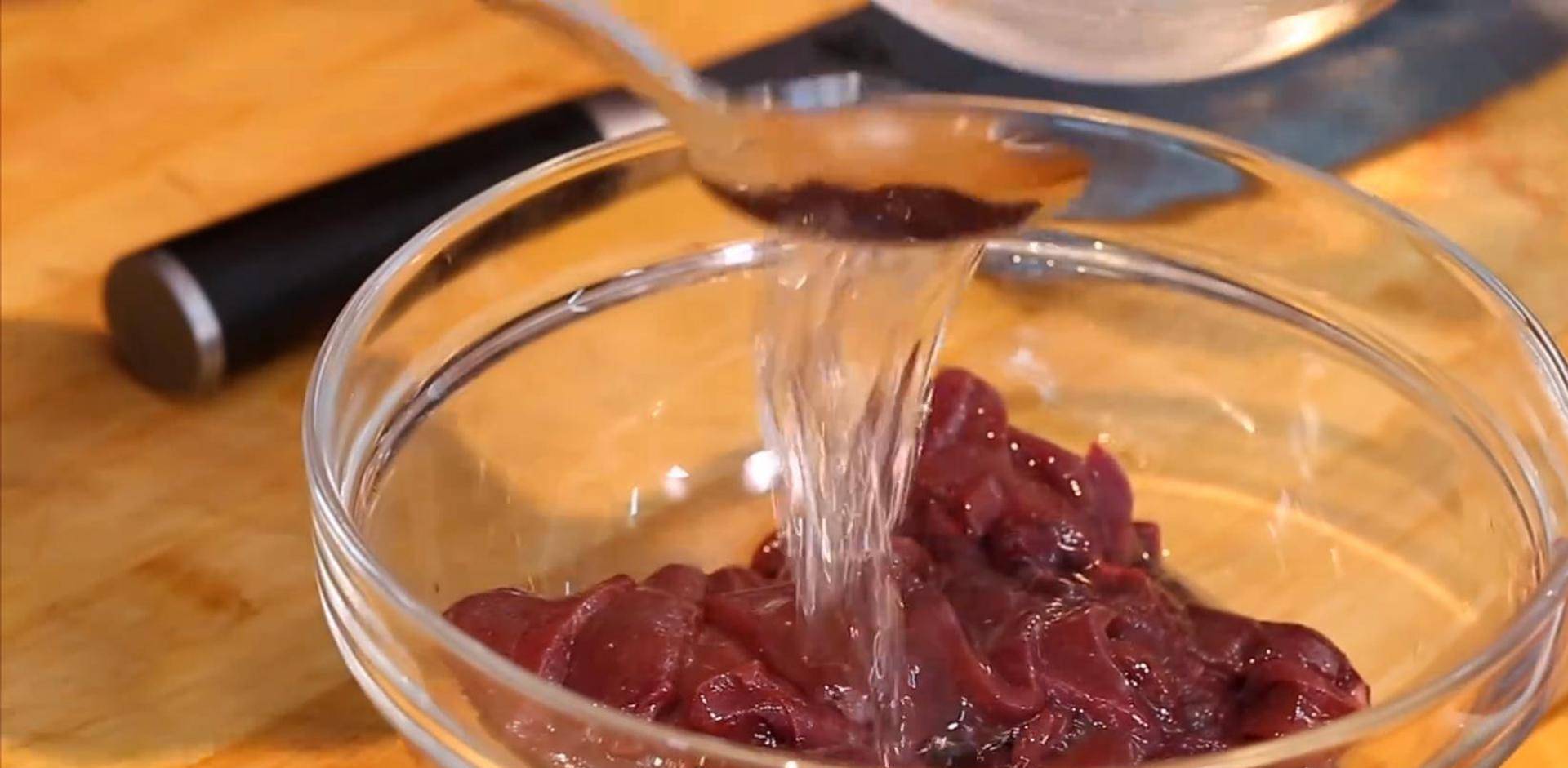 3、猪肝冲洗干净后,一手按住猪肝,使用推拉式的刀法,将猪肝切成1元硬币厚度的薄片。切的过薄,水分会挂不住;如何洗猪肝:把猪肝切大块,放在盐水里浸泡10分钟,用流动的清水反复冲洗至无血水渗出。