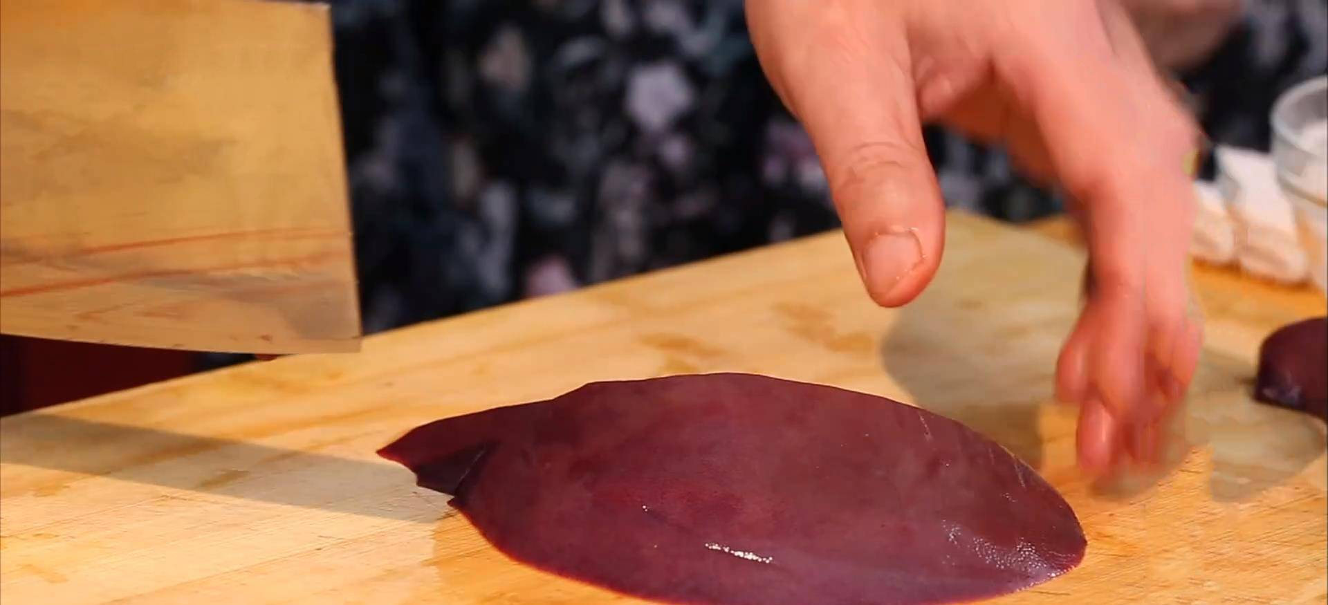 小贴士: 因为猪肝有韧性,如果切猪肝薄厚掌握不好时,先将猪肝切成块状,再放入冰箱速冻5分钟,当外面形成一层壳,然后快速改刀切成薄片。