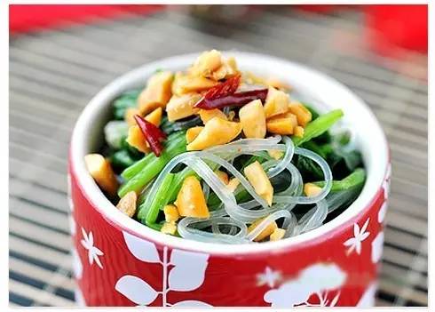 用料: 菠菜900克,粉丝1小把,红尖椒半个,杏仁12个,蚝油少许,芝麻油少许,色拉油适量,食盐4克 做法: 1、菠菜切去根部,清洗干净,切段;粉丝用凉水泡软;烧一大锅水,水开后放进菠菜,加入油、盐,水再次煮开即可捞起放进准备好的凉开水里 2、烫过菠菜的水继续用来烫粉丝 3、把烫熟的粉丝和菠菜捞起,沥干水分,装进大碗里,淋入麻油、加入蚝油,用筷子拌匀,撒上红椒粒和杏仁碎装饰即可 8、凉拌海带丝