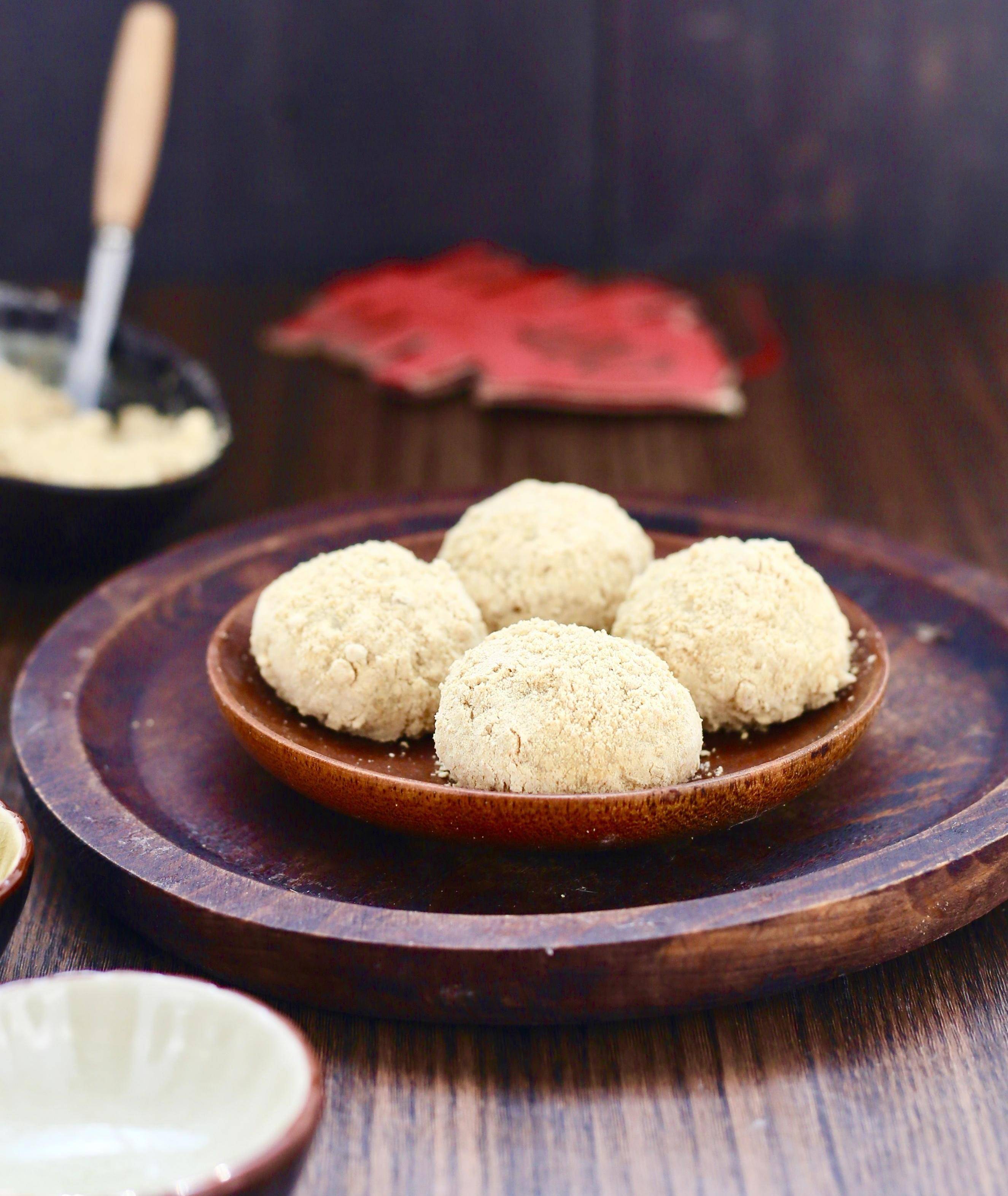 11. 将糯米面团称重后分成18等份,与黑芝麻团等量;
