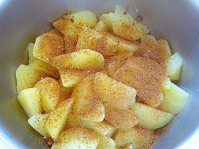 3、煮好的土豆块里放入混合的烧烤粉拌匀,这个混合烧烤粉就是咱们日常里所吃的那种,材料里包括:盐、孜然粉、芝麻粉、辣椒粉、小茴香粉等等,是有咸度的,就不用额外放盐了。