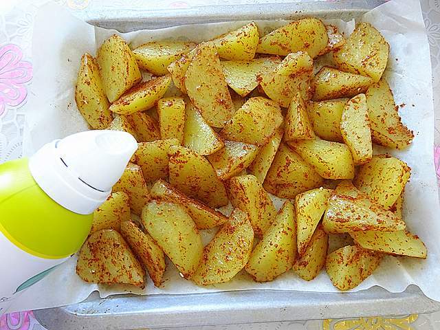 4、拌好调料的土豆块摆入烤盘,上面喷点食用油。