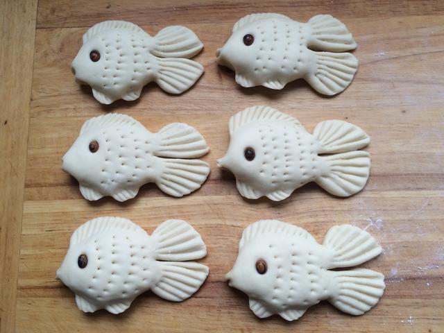 用料 花豆等同小鱼数量;面粉300克;酵母3克;水150克 做法 除花豆以外的所有食材混合均匀,揉成光滑面团,醒发至1.5倍大,把发好揉匀的面团分成60克的剂子 整形成所示的形状 用刀切开尾部,所示 用竹签在鱼尾上压出花纹 捏出鱼儿的嘴 用竹签挖出鱼鳍,所示 安上小花豆眼睛 捏出下面的鱼鳍 压出花纹,并用竹签压出鱼鳞可爱的小鱼儿就做好了,凉水上锅,醒发20分钟,开火,水开后计时15分钟,关火,3分钟后开锅盖。 小鸡馒头
