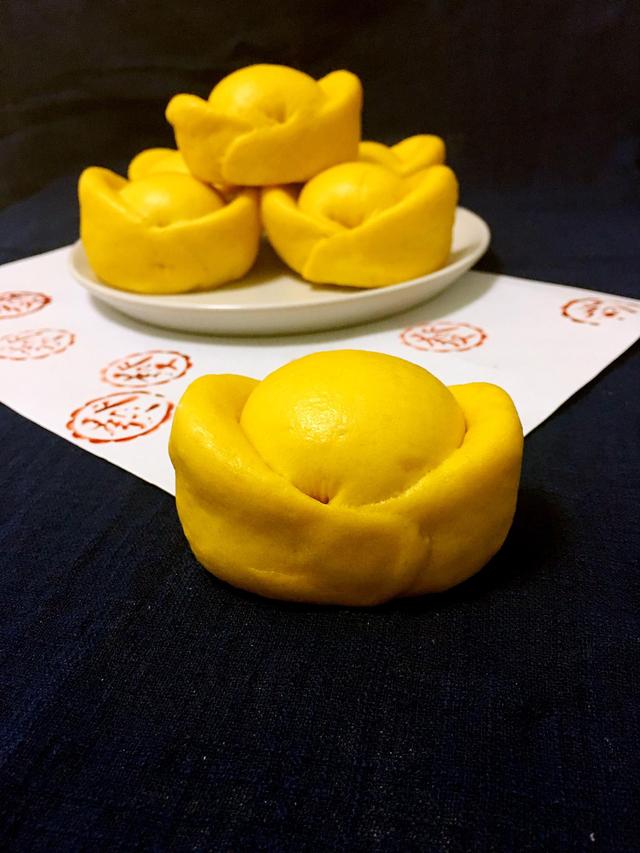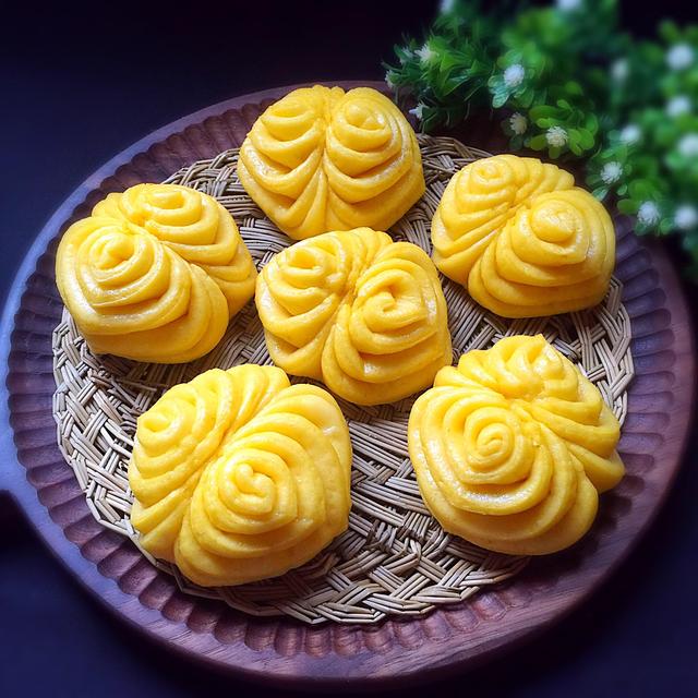 用料 面粉400克;酵母3克;牛奶240克(根据面粉酌情添加) 做法 将面粉、酵母、牛奶混合均匀,揉成光滑的面团。 放在温暖处醒发至两倍大,用手指戳个洞,洞口不回缩塌陷,就可以了。 分成每个20克,四个一组。 搓成长约22厘米的条。 摆成井字,。 第一圈是顺时针转着压,交错着,将奇数的面条压在偶数的面条上。 第二圈是逆时针转着压,交错着,将偶数的面条压在奇数的面条上, 再重复6、7步骤一次,至编完。尾部压紧。 翻面,将底部捏紧。 再翻过来,用手轻轻搓成球形。 放在油纸或刷油的笼屉上,醒发15到20分钟。冷水上锅,大火20分钟左右。 蒸好以后,不要马上开盖,等个4、5分钟,以免馒头回缩。 南瓜花卷馒头 插播:花样馒头做法 @掌厨