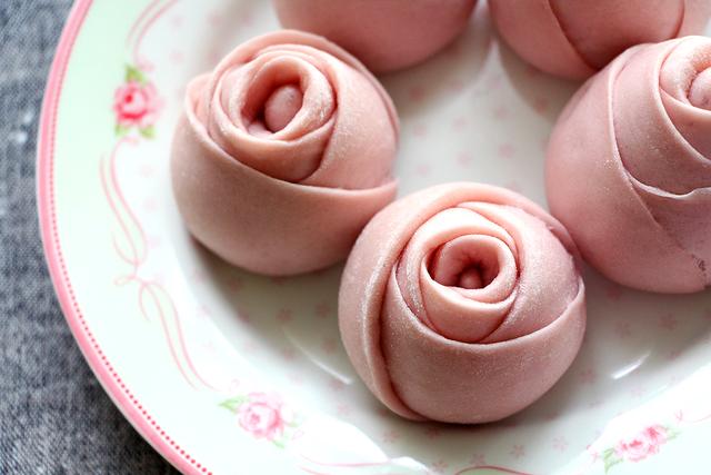 用料 紫薯75g;牛奶100g;水85g;干酵母3g;中筋面粉310g 做法 75g紫薯先上锅蒸熟。 然后切成小块,倒入料理机里,再加入100g牛奶。 启动蔬果模式,搅打成细腻的紫薯泥,备用。 然后取85g水,倒入一个干净的容器中,加入3g干酵母。 静置5分钟,等干酵母充分溶解。 然后倒入一个干净的面盆里,再加入120g紫薯泥和310g面粉。 揉成一个光滑的面团。 水、面的量可以根据实际情况略作调整,以不黏手为准。 然后盖上保鲜膜,进行发酵,建议温度30度,一个小时。 发酵好的面团在面板上反复按压排气。 然后平均分成8个小面团。 取一个小面团,再分成7份,其中6份分量相同,我的每个是10g,另一个分小一点,做成玫瑰花馒头的芯。 然后6个稍大的面团用擀面杖擀成圆形的片状。 把6个圆面片叠在一起,用一根筷子在中间位置压一下,~ 然后把另一个小面团用手搓成锥形,放在起始的位置。 包裹着锥形的面团,从下往上卷起来。 然后用刀在中间的位置,切开,一分为二。 把切口朝下,整理一下造型。其余的面团同样的操作,全部做好。 然后进行二次发酵,建议温度32度,发酵30分钟。 发酵好之后,放到蒸屉里,上锅蒸,水开之后改小火,蒸20分钟即可,蒸好之后静置5分钟再掀开锅盖。一锅玫瑰花馒头就 做好啦~ 花样馒头