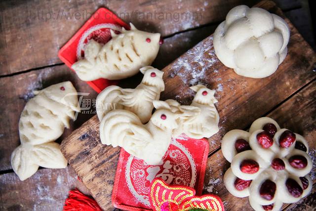 用料 富强粉500克;水250克;酵母5克;白砂糖10克;红枣适量;红豆适量 做法 配料: 富强粉500克,水250克,酵母5克,白砂糖10克;红枣若干,红豆若干 计量好所有材料,将酵母放入少量温水中; 所有材料混合,揉匀,直至揉成光滑的面团. 将面密封保鲜膜,置于温暖潮湿处发酵一个小时,直至发酵至两倍大,发酵完成后面团揉至光滑, 取鸡蛋大一块面团,用擀面杖擀成1cm厚扁片. 用剪刀将面团一端剪成尖尖的鸡头,另外一段建成鸡尾. 最后剪成的样子 用勺子压出雄鸡身上的装饰花纹,在鸡尾压出四道弧线做出鸡尾. 其他的装饰纹所示. 取一小块面团,剪成鸡翅的样子. 将鸡翅贴在雄鸡面团上. 取一小块面团捏成菱形. 放在头部作为鸡冠. 最后将一颗红豆塞在雄鸡眼睛部分,雄鸡造型就做好了!鸡年大吉! 将做好的雄鸡馒头发酵十五分钟,冷水开火,蒸十分钟就可以出锅了. Tips:雄鸡馒头由于装饰花纹是用勺子压制的,所以发酵时间要控制稍微短一些,如果发酵过头,花纹就消失了.花样馒头装饰性很重要,所以不要发酵时间太长. 下面制作锦鲤馒头: 取网球大小的面团搓成梭子状. 在一段用剪刀剪开一个三角形做尾巴,剪开的尾巴分叉大一些. 在尾巴根处剪开一个三角形,做成鱼尾的样子. 另外一端同样在尾巴根处剪开,做成尾巴. 修整锦鲤身体的形状,尾巴歪向一侧. 注意的是,尾巴和尾巴根要做的的细一点,随后发酵还要膨胀,太粗影响造型. 在锦鲤1/3处剪开鱼鳍,所示 鱼嘴横着剪开. 鱼嘴塞一颗红豆. 用勺子压出鱼鳞,鱼鳞相邻两排错开排列. 锦鲤造型做好了. 下面制作绣球造型: 面团搓成四条长条型. 每根顺次压住下一根,编成所示的绳结. 将相邻的两根再交错编起来,所示. 将所有的面团收到下面,捏紧,多余的部分去掉即可. 绣球馒头就做好了. 下面制作枣花馒头: 面团搓成长条形 头尾相连,再在中间放一颗小枣,一个花瓣就做好了. 重复以上步骤,做6瓣花瓣. 同样方法制作第二层花朵,第二层制作5瓣花瓣,并且每个花瓣都要比下层的稍小. 发酵20分钟左右,冷水开火,蒸十分钟就可以出锅了. Tips:馒头在蒸的时候还会膨胀,每个馒头之间要留有足够缝隙.所以馒头不必一次性入锅蒸,可以分开蒸几次,这样保证馒头不会贴在一起. 出锅了~~ 元宝馒头