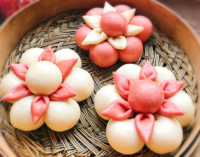 用料 面粉300克;酵母3克;温水150克;红曲粉少量 做法 准备好面粉 酵母用温水化开缓缓加入面粉中 用筷子搅拌成絮状 揉成光滑的面团,平均分成两份 一份加入少量红曲粉 揉成光滑的粉色面团盖上保鲜膜备用 先取白色面团8克6个整形滚圆 用食指在滚圆的小面团上按压一下 捏成花瓣状 摆放好成花朵 再取适量粉色面团擀成薄片用圆形模具刻成圆形状,大小自己掌控 平均切割成六份 每个小三角左右对折 均匀的摆放在整形好的白色面团上 中间放上一个整形好的8克粉色圆面团,花朵馒头就整形完成,依次做好全部 颜色可自行搭配调整,全白、全粉、粉白、白粉根据自己的喜欢,怎么都好看 整形好的花朵馒头 放入温暖处进行发酵,此馒头属一次性发酵,需要一次性发酵到位,约发酵至两倍大小 发酵好后冷水上锅大火蒸20分钟左右关火焖3~5分钟 美美哒 花样馒头小鱼儿