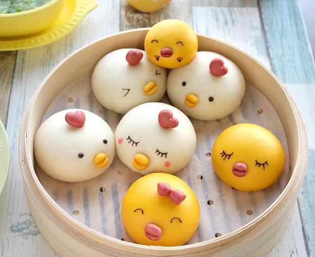 用料 ①白色面团:;普通面粉200g;水110g;干酵母2g;普通面粉(发酵好之后整形的时候用)适量;②黄色面团;水20g;干酵母2g;普通面粉250g;南瓜泥110g;普通面粉(发酵好之后整形的时候用)适量;③红曲粉一小撮;④装饰用:;黑巧克力适量;粉巧克力适量 做法 先来做准备工作~ 南瓜切成小块,放到蒸锅上蒸熟,这里强调一下,南瓜本来就水分大,蒸的时候最好盖上保鲜膜。 蒸熟之后,用料理机打成南瓜糊糊,越细越好。 下面来揉面,取一个干净的容器,倒入110g水,加入干酵母,静置2分钟,等酵母化开。 然后加入200g面粉,揉成光滑的面团即可。 盖上保鲜膜,放入温暖处进行发酵。发酵至2倍大就可以了~ 我是放到烤箱里的,30度,一个小时。 然后来做南瓜面团,一样的操作,20g水先加入2g干酵母,静置2分钟之后,加入110g南瓜泥,250g的面粉,然后揉成一个光滑的面团,盖上保鲜膜,放入温暖处进行发酵。 *每个人的南瓜泥稀稠程度不一样,可以酌情添减面粉。 发酵好之后取出,在撒了干粉的面板上不断按揉排气,手法可以参考我微博里发的做馒头的视频,只有这样反复不断揉,做出来的馒头表面才是光滑的。 然后白色的大面团分出来5个60g的小面团,揉圆~ 黄色的分出来6个60g的小面团,揉圆。不会揉馒头的,可以参考我微博里面直播的馒头制作过程。 然后取剩下的白色面团加一小撮红曲粉,揉成光滑的红色面团。 然后擀成薄面片。用中号圆形裱花嘴切出来圆形,再用刀切成心形的鸡冠,剩下的红色面团分成0.5g一个的小面团,揉圆之后用刮板在中间位置切一下,做成黄色小鸡的嘴巴。 鸡冠摆到相应的位置。剩下的黄色面团,也是分成0.5g一个小面团,揉圆之后用刮板在中间位置切一下,做成白色小鸡的嘴巴。 全部做好之后,放入蒸屉里,注意保持距离,静置20分钟。我是室温静置的,室温大概20度左右。 然后烧水,烧开之后改成中火,放到锅上蒸15分钟,蒸好之后不要掀盖子,静置5分钟再掀开。 最后把巧克力装到裱花袋里,加热融化之后,前端剪一个小口,画上各种表情即可~ 完成~~有多余的面团可以做成小小的鸡宝宝,也很可爱~巧克力画的表情加热不会融化的,我就是吃的时候再加热一下,没有问题~ 玫瑰花馒头