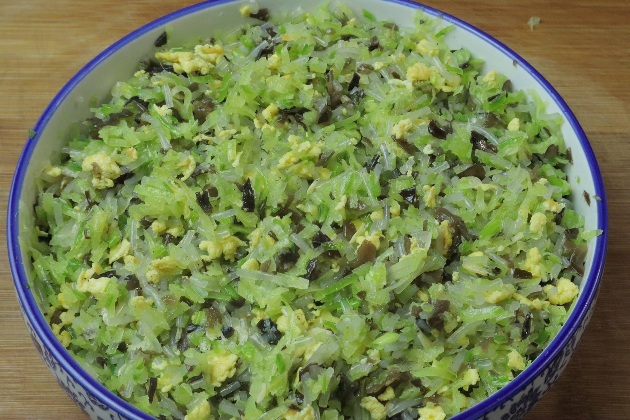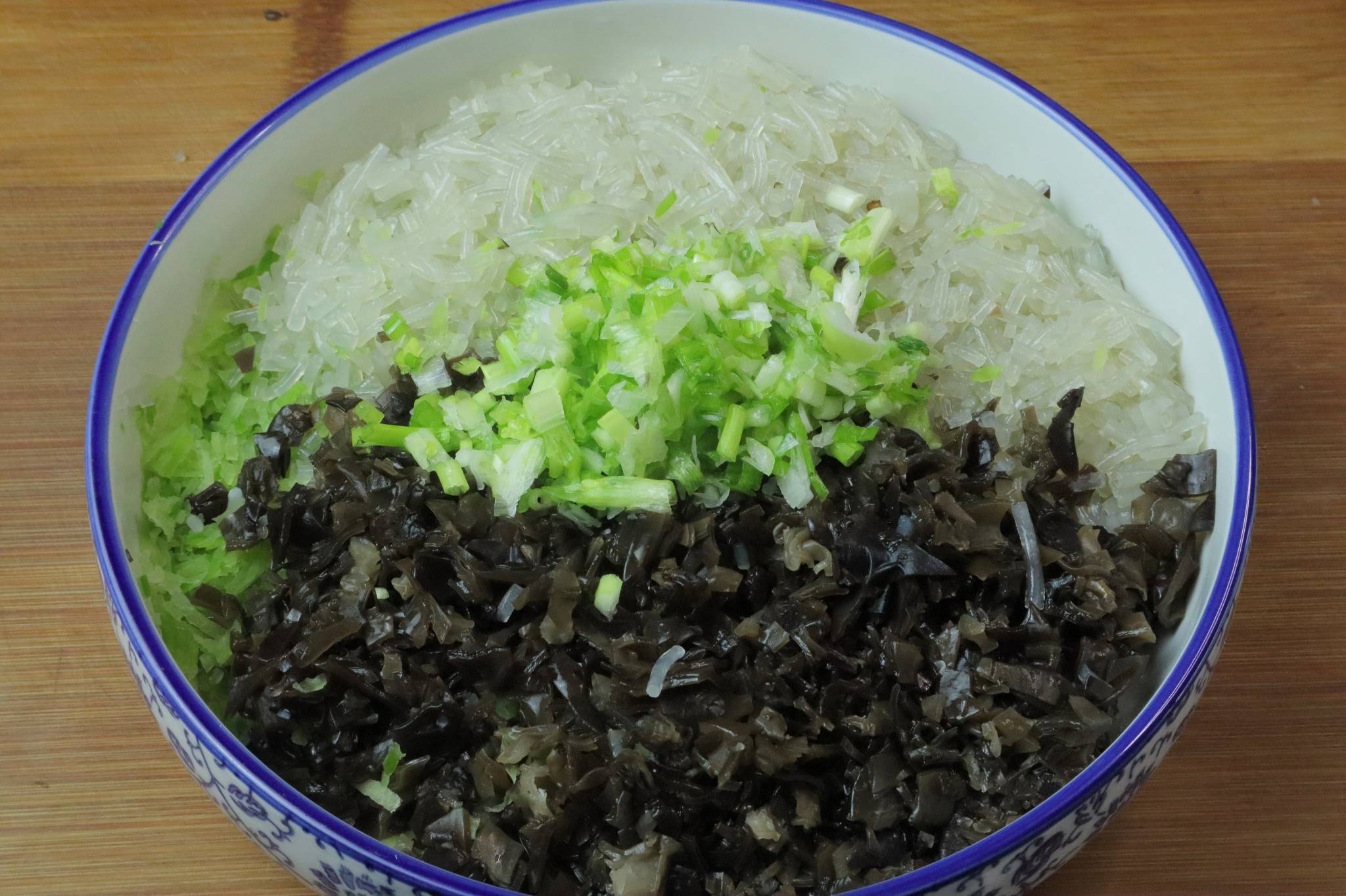 第三步:萝卜腌好了,腌出很多水分,用手挤干净,切碎入盆。一把提前泡好的粉条,切成小碎节;泡好的木耳切成小碎片;小葱切成葱花;锅中热油,打入三颗鸡蛋,炒成鸡蛋碎,全部倒入盆中,最后加一把虾皮增鲜。