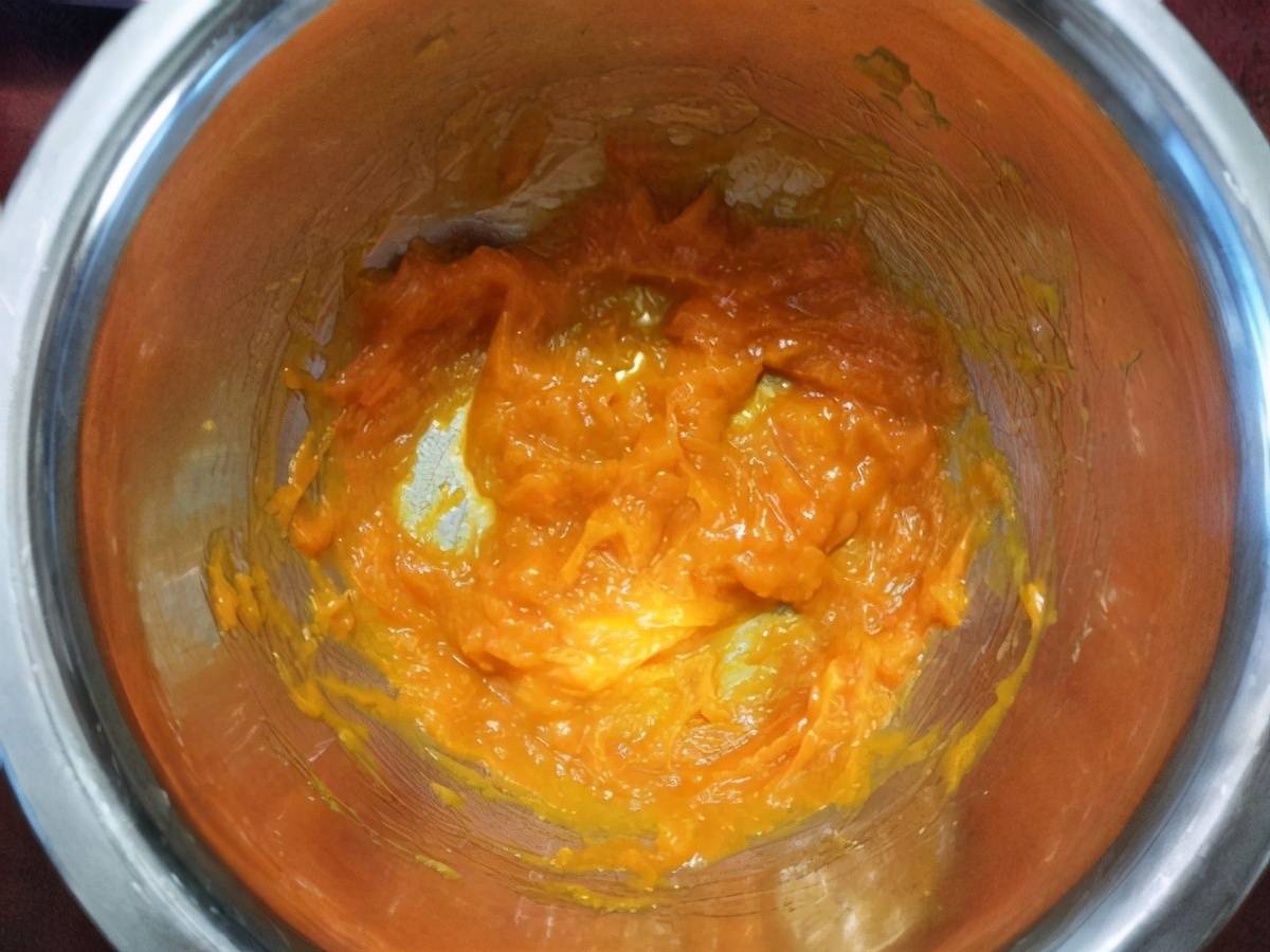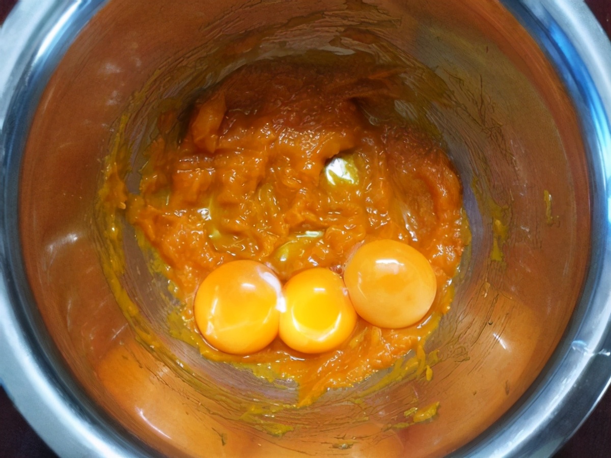 2、我们取75克的南瓜,然后用打蛋器把南瓜搅散。拿出一个干净的小碗,把三个鸡蛋打进去,之后把蛋黄和蛋清分离。蛋清放在冷藏里备用,蛋黄放进刚刚打好的南瓜泥里。用打蛋器继续把南瓜泥和蛋黄搅拌均匀。