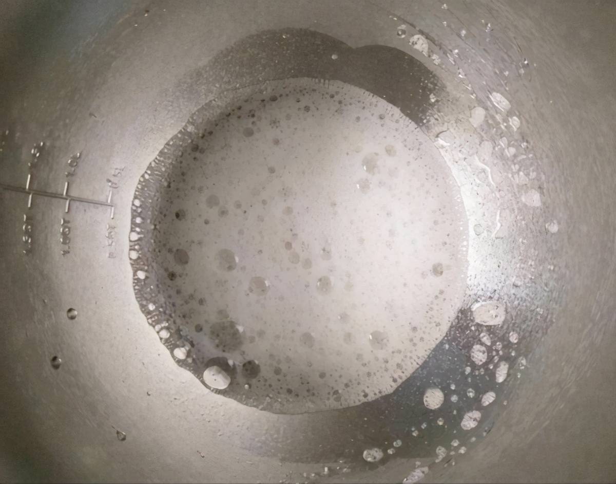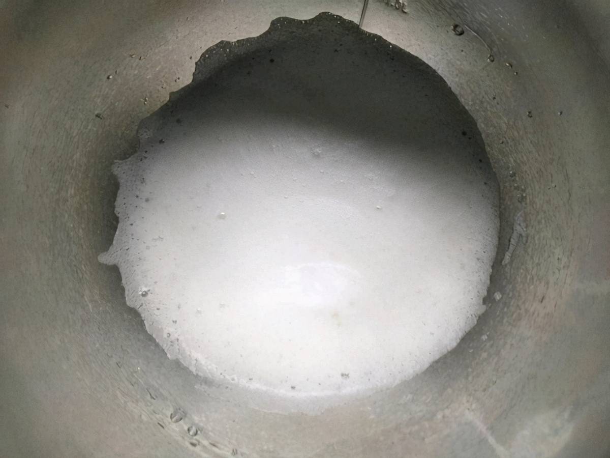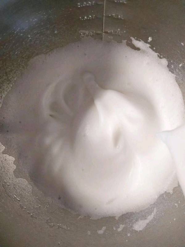 5、从冰箱里把蛋白取出来,取出之后用电动打蛋器不断地打发,一直到打出粗泡,把准备好的细砂糖的1/3加进碗里。继续用打蛋器打发,打到如图这种状态就可以加入剩下1/3的白砂糖。
