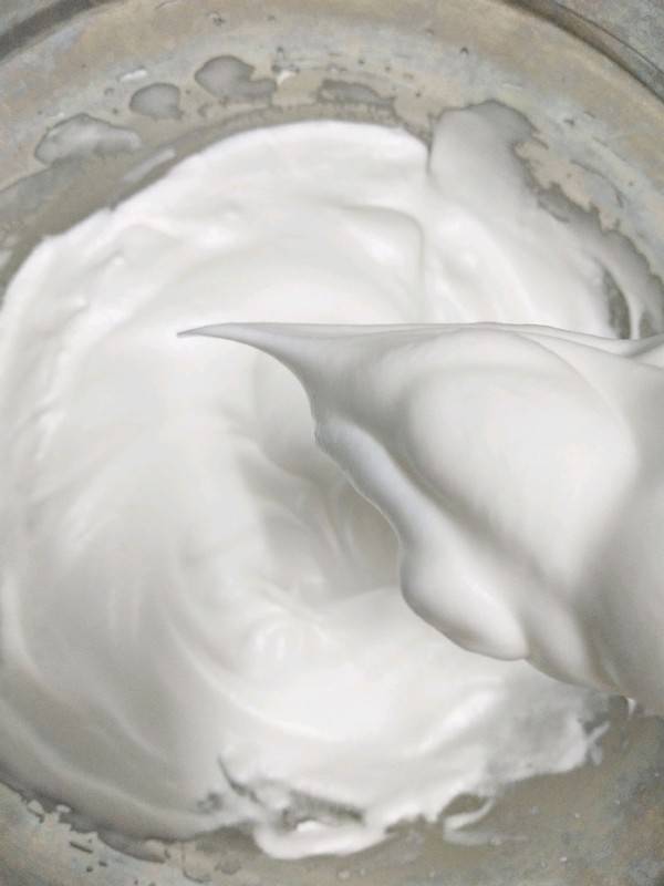 6、继续打发到如图的状态,就可以把所有的白砂糖全部都加进去了。用电动打蛋器继续进行打发到如图的状态,这样我们的蛋白霜部分就完成了。