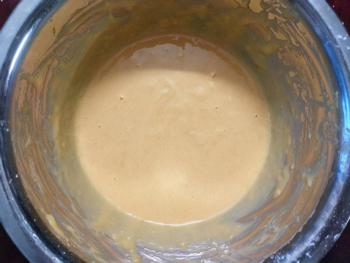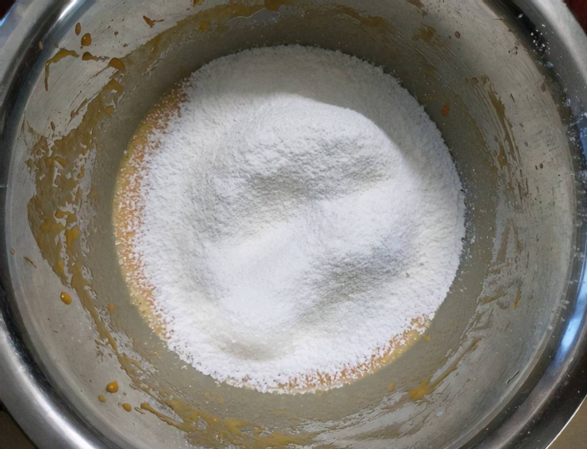 3、再加入牛奶和玉米油,用打蛋器继续搅拌。低筋面粉用筛子过一下筛,过筛之后也倒入刚刚的大盆里。