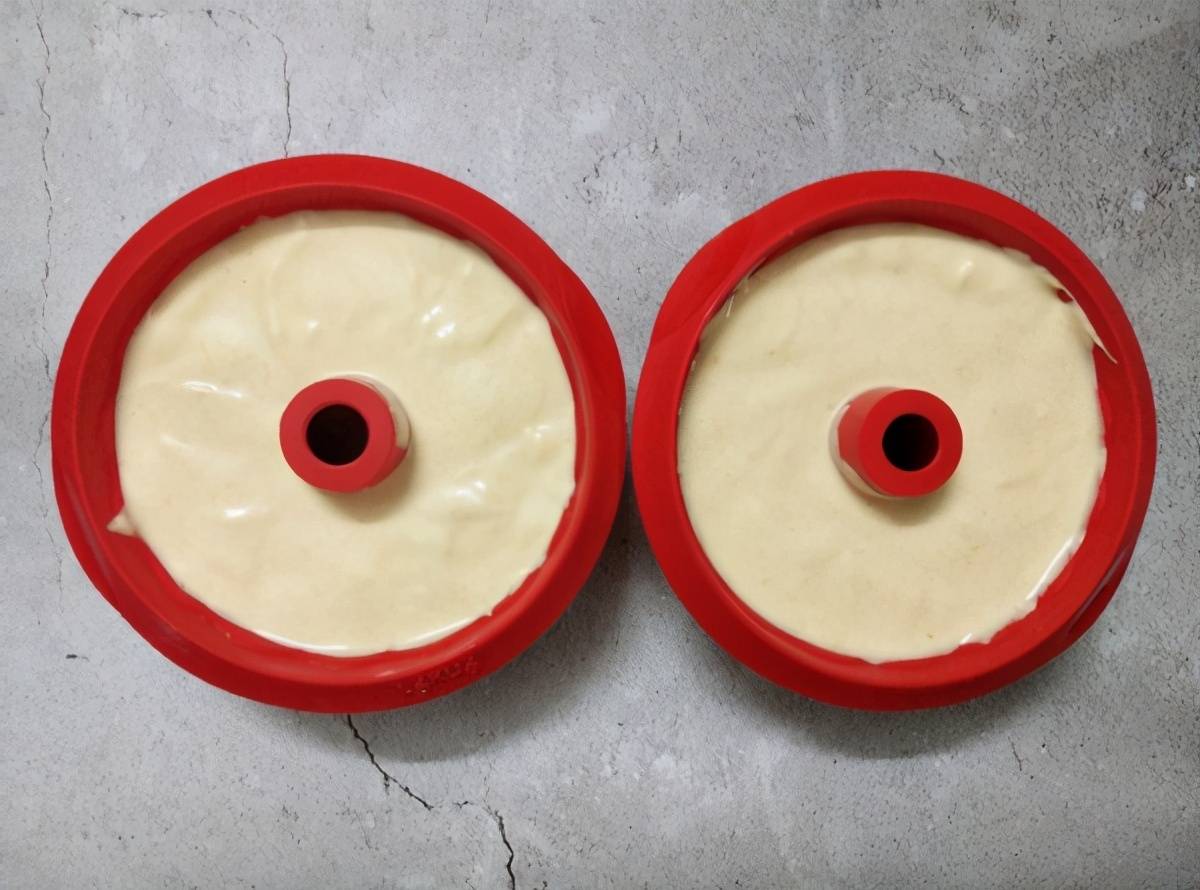 9、模具清洗干净之后,把刚刚翻拌好的蛋糕糊全部倒进这两个模具里,往桌子上轻轻地震几下,这样面糊就会更均匀,震出气泡口感也会更好。烤箱预热好了之后就可以把模具放进去了,上下火160度烤45分钟。蛋糕烤好之后倒着轻轻震一下,晾凉之后就可以脱膜了,大家就可以品尝这个美味的南瓜戚风蛋糕了。