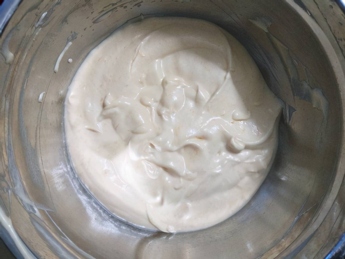 7、取出了1/3蛋白霜,放在刚刚做好的蛋黄糊的盆里,拿出刮刀把它们翻拌均匀。