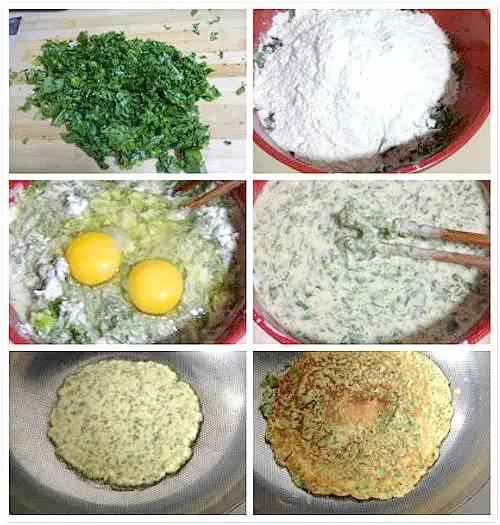 【食材】 面粉1000克、鸡蛋3个、黄瓜1个、油、盐。 【做法】 ①鸡蛋打入进面粉里;黄瓜切成丝;加少许水将所有材料混合搅拌均匀,加少许食盐调味; ②平底锅烧热后刷少许食油,取适量黄瓜鸡蛋面糊糊倒入锅内,两面都煎至黄金后出锅即可; ③找一个圆形盖子,将饼按压成小小的圆形。 7、芹菜叶鸡蛋饼