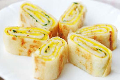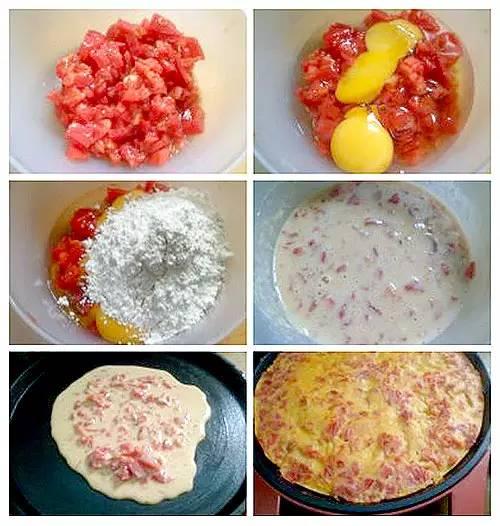 【食材】 面粉半碗、鸡蛋2个、淀粉、白芝麻、油、盐4克。 【做法】 ①面粉、水、淀粉、盐、适量油混合,搅拌均匀; ②平底锅倒少许油,然倒入面糊,用勺子摊成面皮,将鸡蛋液覆盖在面皮上,借助勺子将蛋液铺均匀; ③撒葱花、芝麻和肉松,待蛋液即将凝固的时候将饼卷起,卷起后小火再煎一下,待蛋卷上色成金黄即可切块装盘。 5、西红柿鸡蛋饼