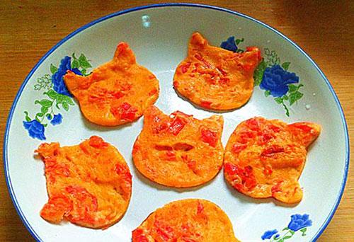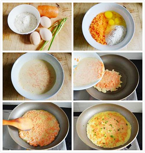 【食材】 胡萝卜200克、鸡蛋2个、面粉50克、油、盐4克、葱。 【做法】 ①胡萝卜洗净擦成细丝;热锅放油,下入胡萝卜丝,大火翻炒一分钟后舀出;鸡蛋打散成蛋液,下入面粉,搅拌成糊状,下入炒好的胡萝卜丝与葱花,加入适量的盐,再次搅拌均匀; ②平底锅内放入适量的油,用勺子将适量面糊舀入,盖上锅盖,煎至两面金黄中间熟透即可出锅。 4、鸡蛋卷饼