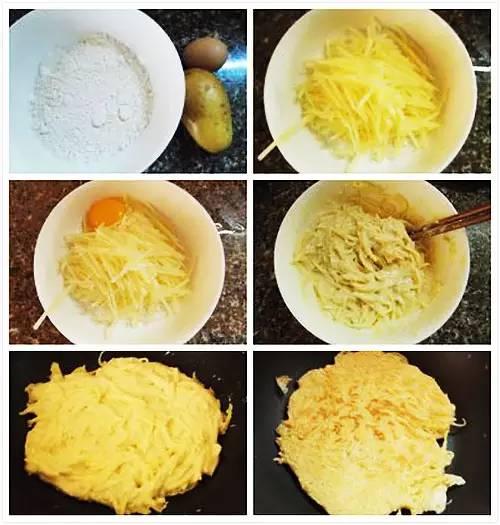 【食材】 土豆1个、鸡蛋1个、盐 【做法】 ①土豆洗净去皮切擦丝,放入面粉里;打入鸡蛋,用少量的水拌匀,加一点盐调味; ②平底锅倒入少许油加热,放入拌好的土豆,倒入锅中摊成小饼,两面金黄后取出。 3、胡萝卜鸡蛋饼