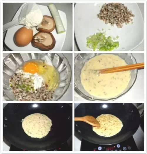 【食材】 面粉、鸡蛋、香菇、盐、葱、虾皮。 【做法】 ①香菇洗净切碎;小葱切碎;虾皮切碎;鸡蛋打入碗中,取适量面粉放入其中,倒入适量的水搅拌均匀; ②把切好的香菇碎,小葱和虾皮一起放入碗中加少许盐,搅拌均匀; ③平底锅倒入少量油,两面煎至金黄即可出锅。