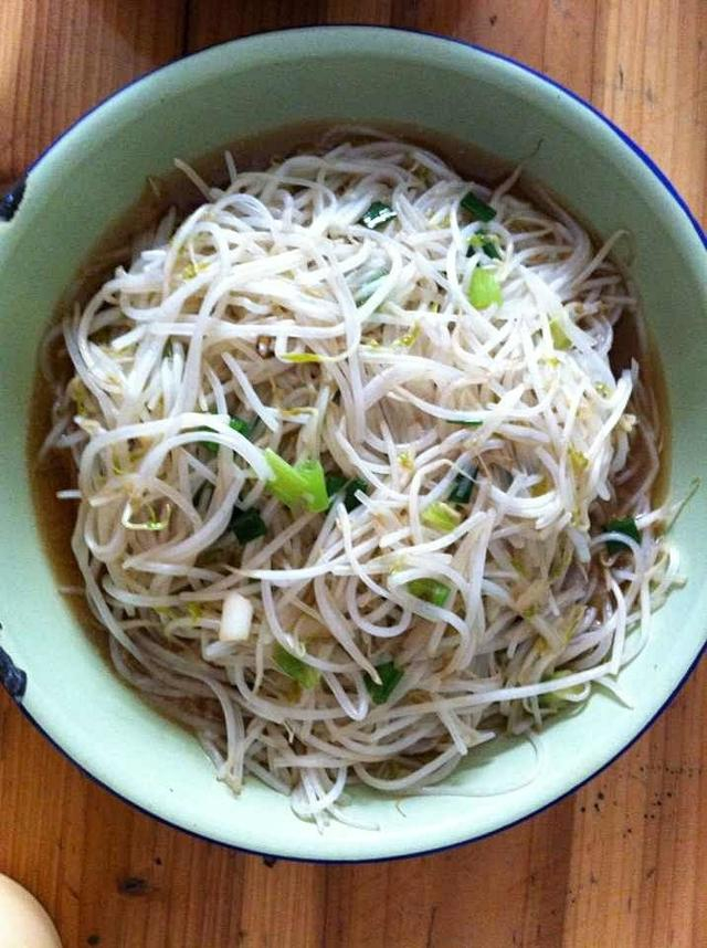 用料 绿豆芽1包;鸡蛋2个;食盐少许;胡椒少许;葱花少许;食用油适量 做法 把绿豆芽洗干净沥干水 在蛋液里加少许食盐和胡椒粉搅拌均匀 再热锅中加食用油,再倒入蛋液,用筷子搅开,出现小块状半熟状态后盛出 在同一个锅内再加适量食用油,倒入沥干的绿豆芽,加适量食盐和胡椒粉调味 在豆芽炒熟了之后倒入刚做完的半熟的鸡蛋,并充分搅拌翻炒,加少许葱花装饰即可 凉拌豆芽