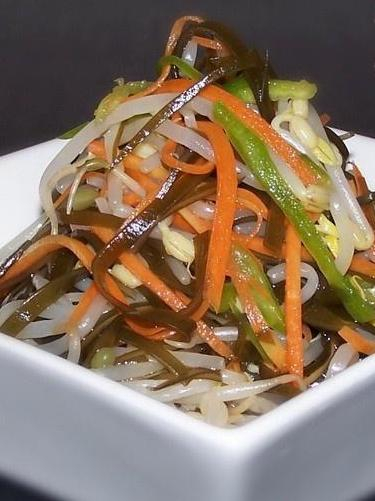 用料 海带100克;豆芽100克;胡萝卜1只;青椒1只;盐适量;生抽适量;醋适量;香油适量;糖适量 做法 将海带清洗干净在清水里浸泡2-3小时 锅中烧水将海带煮15分钟捞出,晾凉后切成丝 豆芽快速焯水捞出过凉水,胡萝卜、青椒切丝待用 在海带丝、豆芽、胡萝卜丝,青椒丝里调入盐、生抽、醋、糖、香油拌匀即可 豆芽拌面
