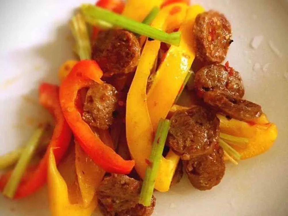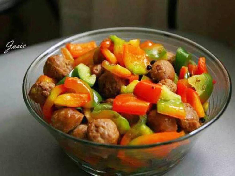 1、甜椒切片,用盐腌渍片刻,牛肉肠切成小段; 2、适量油,加入黑胡椒原颗粒爆香,然后放入牛肉段炒至脱生; 3、倒入甜椒一起翻炒,加少量盐和生抽调味,待牛肉熟透,甜椒脱生后就可以出锅了。 十四、凉拌牛肉丸的做法 ▼