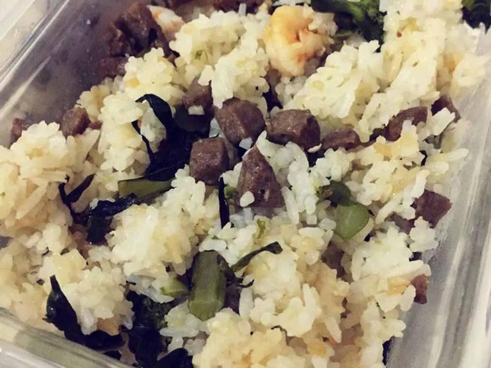 1、材料洗净切丁准备好,蒜2瓣就可以,要剁成泥,要不吃起来蒜味太浓,电压锅加油,把牛肉丁放进去翻炒,炒好盛起来备用; 2、牛肉丸有油,所以剩下的油用来炒芥蓝,先加入蒜泥爆一下味道; 3、把菜跟先炒一下再饭菜叶; 4、芥蓝炒完放入虾仁炒; 5、下盐(前面牛肉丸是不用下盐的,因为本身就有味道),加入牛肉丸粒一起翻炒; 6、最后把煮好的饭加在锅里再继续翻炒就可以了,想要点颜色可以加一点点酱油。 四、青椒牛肉丸的做法 ▼