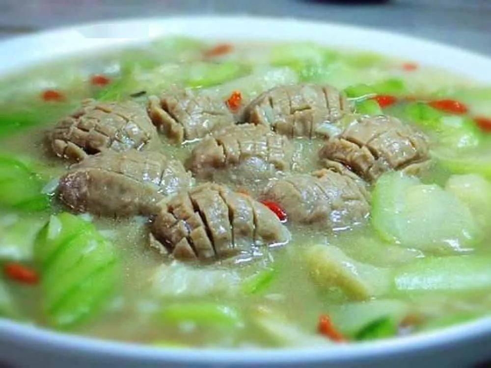 1、枸杞菜捏住顶芽从上往下快速捋去叶子,洗净沥干水; 2、枸杞菜洗净后剪段放入汤锅中; 3、锅中加水至淹过枸杞菜枝子再多点,煮8分钟,捞出枝子扔掉; 4、将枸杞菜叶子放入汤中煮至稍微软身,放入牛肉丸一起煮; 5、煮至叶子完全软身即可关火,加入少许鱼露调味; 6、撒上炸蒜末(蒜头朥)即可上桌。 六、豆腐牛肉丸汤的做法 ▼