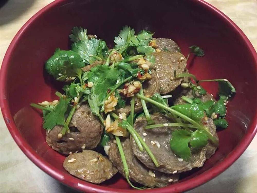 1、先把牛肉丸切片放进油锅里边炸熟 捞起来弄干油放进碗里; 2、把香菜,蒜,辣椒,剁碎; 3、把2放进碗里倒入酱油 香油 辣椒油 搅拌起来; 4、再放进牛肉丸里边搅拌均匀就ok了。 十五、咖喱牛肉丸的做法 ▼