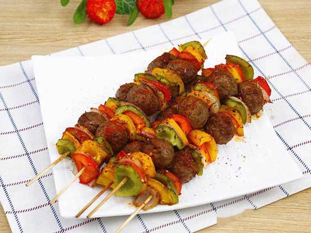 1、先把所有材料准备好,并提前清洗干净,辣椒,洋葱切块,然后按自己喜欢的顺序串起来,然后放在烤盘上; 2、把酱油和油混合起来,涂满牛肉丸串全身,撒孜然粉和盐; 3、喜欢有点辣味的可以添加五香辣椒粉,最后撒上孜然粒; 4、放入预热好的烤箱(也适用于炭烤以及其他烧烤的方式),中层上下火200度,烘烤15分钟即可。建议下层再放一层烤盘,里面装点水,这样烤出来的牛肉丸口感不那么干; 5、香喷喷的牛肉丸出炉了,装碟即可食用。 十三、牛肉丸炒甜椒的做法 ▼