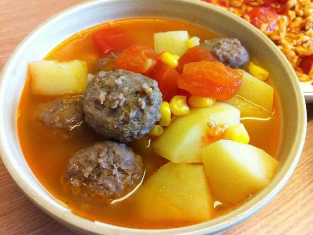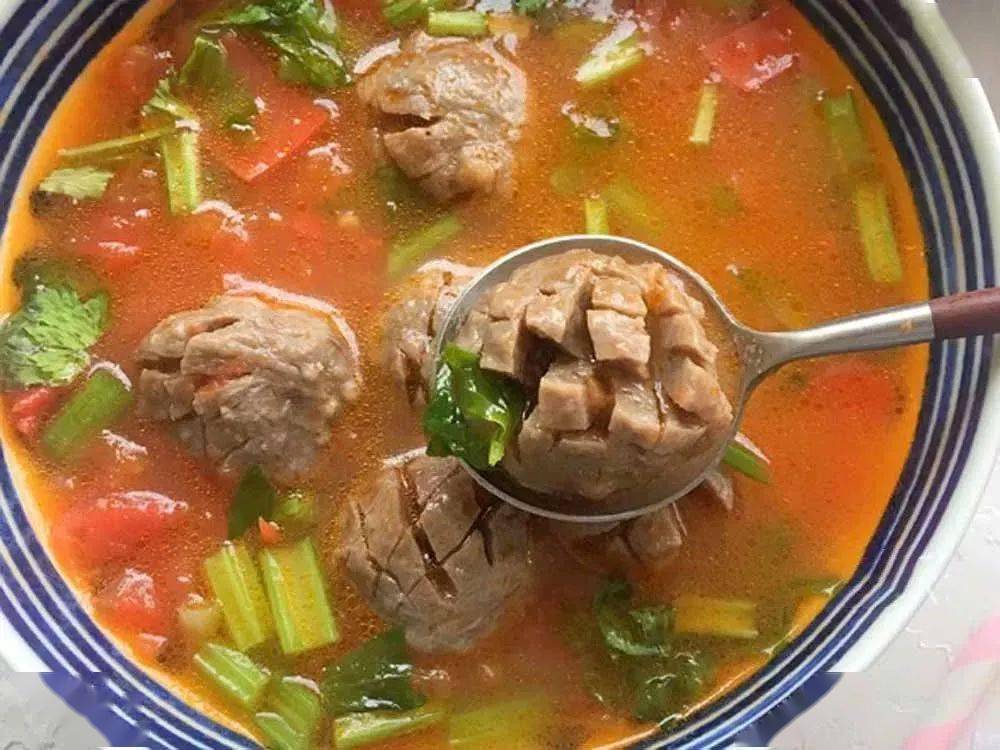 1、土豆切块,番茄去皮切块; 2、汤锅装水,放入牛肉丸汆烫,加入适量酱油; 3、待牛肉丸变色后捞出,煮丸子汤滤去血沫备用,平底锅加油烧热; 4、放入番茄炒至出汁,倒入汤锅,煮开后放入土豆继续煮; 5,土豆稍软后放入牛肉丸继续煮,带土豆软熟后倒入玉米粒; 6,煮沸后添加适量鸡精、香油调味即可。 五、牛肉丸枸杞菜汤的做法 ▼