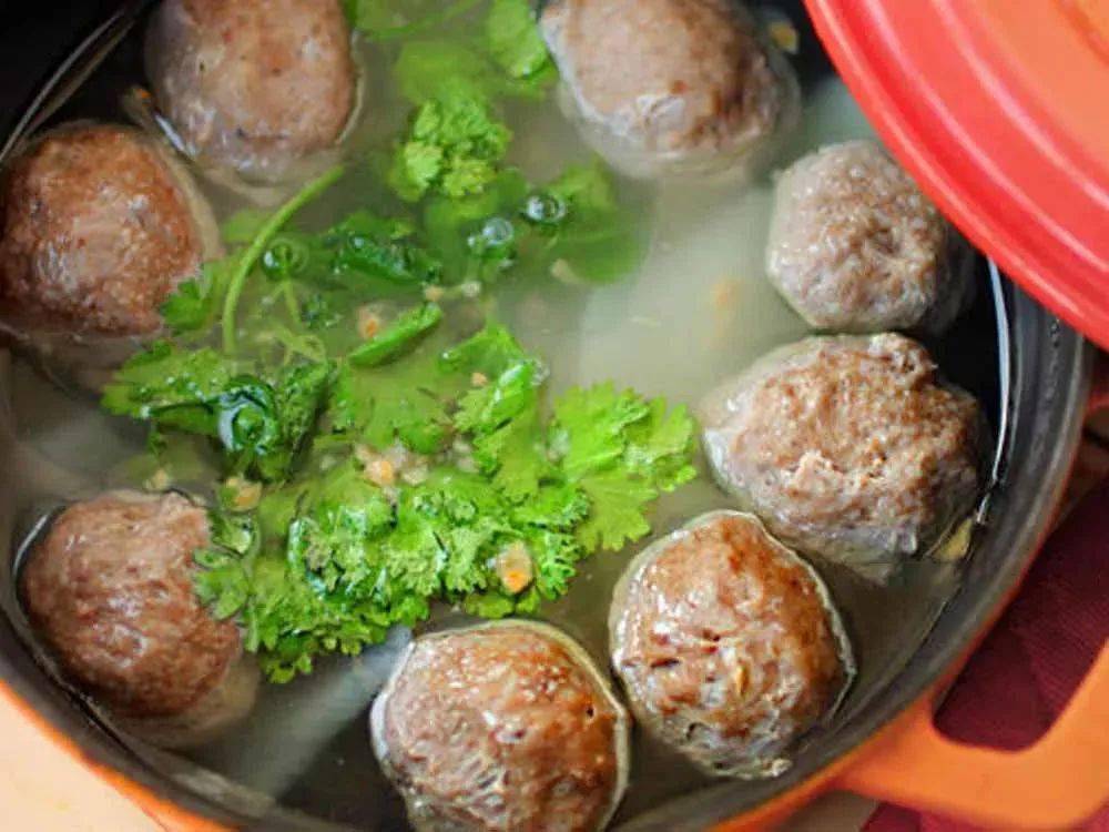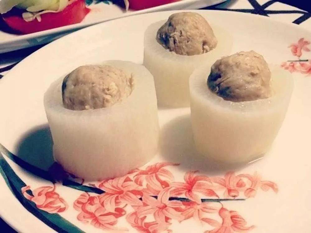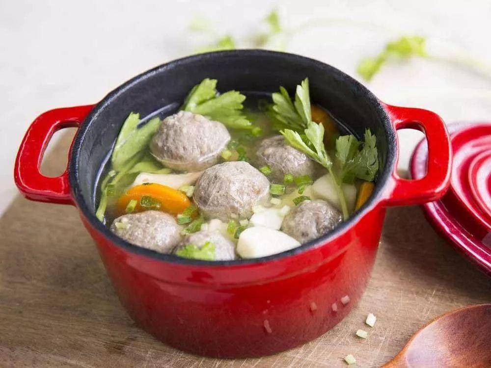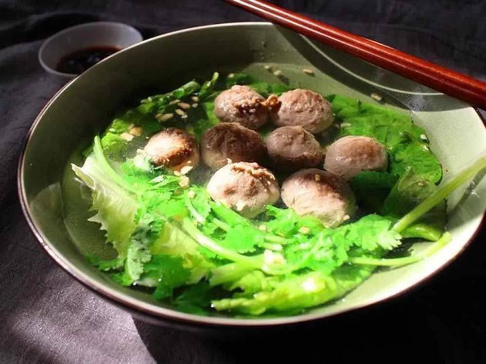 1、准备牛肉丸,西生菜、香菜洗净; 2、再准备些潮汕辣椒酱、炸蒜茸,西生菜和香菜放在大碗中; 3、烧热一锅水至80-90度,放入牛肉丸煮,水开后再煮2分钟左右; 4、待牛肉丸变大浮上水面,即可关火。加入1/2茶勺盐调味; 5、趁热将牛肉丸连同煮牛肉丸水一同倒入生菜、香菜碗中,汤面撒上炸蒜茸——美味又简单的潮汕清汤牛肉丸就煮好了。 插播:潮汕牛肉丸制作 @鷇 二、白萝卜牛肉丸汤做法 ▼