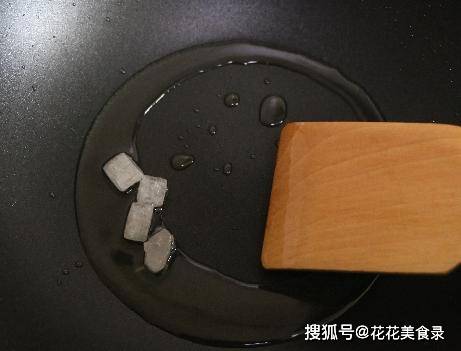 第四步,中小火开始慢慢的煸炒笋干,直到将其中的水分给炒干,笋干的香味散发出来后,即可盛出,重新将锅烧热之后,加上适量的花生油,放入15克的冰糖,小火不停地翻炒,直至冰糖融化且出现比较大的气泡的时候;