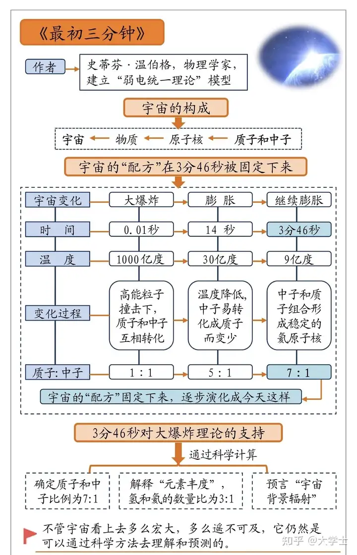 图源知乎:大学士 道生一,一生二,二生三,三生万物。道者,无也。 ——老子《道德经》 宇宙诞生之前,没有时间,没有空间,也没有物质和能量。大约150亿年前,在这四大皆空的“无”中,一个体积无限小的点爆炸了。时空从这一刻开始,物质和能量也由此产生,这就是宇宙创生的大爆炸。 刚刚诞生的宇宙是炽热、致密的,随着宇宙的迅速膨胀,其温度迅速下降。最初的1秒钟过后,宇宙的温度降到约100亿度,这时的宇宙是由质子、中子和电子形成的一锅基本粒子汤。随着这锅汤继续变冷,核反应开始发生,生成各种元素。这些物质的微粒相互吸引、融合,形成越来越大的团块,并逐渐演化成星系、恒星和行星,在个别天体上还出现了生命现象。然后,能够认识宇宙的人类终于诞生了。 插播:宇宙真正的起源是什么?情况或超出人类认知! 这幅大爆炸图景,是目前关于宇宙起源最可能的一种解释,被称为“大爆炸模型”。大爆炸理论诞生于20年代,在40年代由伽莫夫等人进行补充和发展,但一直寂寂无闻。直到50年代,人们才开始广泛注意这个理论,不过也只是觉得它很好玩,并不信服。人们更愿意认为,宇宙是稳定的、永恒的。 但是,越来越多的证据表明,大爆炸模型在科学上有强大的说服力。我们不得不相信,宇宙有一个开始,也将有一个终结。它产生于“无”,也终将回归于“无”。 宇宙:可有始,可有终? 在人类历史的大部分时期,有关创世的问题,一向是留给神去解决的。宇宙起源于何处?终点又在哪里?生命如何产生?人类怎样出现?对这些疑问,许多宗教都能给出一份体系完备的答案。至于上帝从哪里来,这种问题是不该问的。 直到最近几个世纪,人们才开始学着把神撇开,以超越宗教的角度,去思考世界的本源。这样一来,就有一个重大的原则性问题需要解决:宇宙是永恒存在的,还是有起始的? 这两种说法长久以来一直困扰着科学家、哲学家和神学家,对于普通人来说,更是难以理解。假设宇宙在时间上没有起源,即过去一直存在,那么宇宙的年龄就是无穷大了。无穷大这个概念,一听就让人头昏脑胀:既然是已经过去了无穷久的时间,我们的“现在”又是什么呢?而如果说宇宙是有起始的,那么它就是从“无”中突然产生的了,这最初的一刹那,又是怎样呢? 凭着人类在短暂的生命中获得的常识,实在是很难想明白这些东西。不过,我们可以从科学上寻求一些佐证。大爆炸模型的一个基本假设是宇宙的年龄有限,这个说法令人信服的直接理由,来自物理学中一条最基本的定律——热力学第二定律。这条科学史上最令人伤心绝望的定律,冥冥中早已规定了宇宙的命运。 简而言之,第二定律认为热量从热的地方流向冷的地方。对任何物理系统,这都是众所周知并且显而易见的特性,毫无神秘之处:开水变凉,冰淇淋化成糖水。要想把这些过程倒过来,就非得额外消耗能量不可。就最广泛的意义而言,第二定律认为宇宙的“嫡”(无序程度)与日俱增。例如,机械手表的发条总是越来越松;你可以把它上紧,但这就要消耗一点能量;这些能量来自于你吃掉的一块面包;麦子在生长的过程中需要吸收阳光的能量;太阳为了提供这些能量,需要消耗它的氢来进行核反应。总之宇宙中每个局部的嫡减少,都须以其它地方的嫡增加为代价。 在一个封闭的系统里,嫡总是增大的,一直大到不能再大的程度。这时,系统内部达到一种完全均匀的热动平衡状态,不会再发生任何变化,除非外界对系统提供新的能量。对宇宙来说,是不存在“外界”的,因此宇宙一旦到达热动平衡状态,就完全死亡,万劫不复。这种情景称为“热寂”。 宇宙正在缓慢地、但坚定不移地走向这无法抗拒的命运,几代智者为此怀疑人类的存在是否有意义。暂且撇开这种沮丧的情绪,作一个简单的推理,我们就可以发现,宇宙不可能有无限的过去。很简单,如果宇宙无限老,那它早就已经死了。以有限速率演变的东西,是不可能永远维持下去的。换句话说,宇宙必然是在某个有限的时间之前诞生的。 大爆炸:有推论有根据 第二定律明示了宇宙有起始,但这个重要推论竟然被19世纪的科学家忽略了,它只是在后来成为大爆炸模型的佐证。该模型的提出,是基于20世纪初的天文观测。 20年代,天文学家埃德温·哈勃注意到,不同距离的星系发出的光,颜色上稍稍有些差别。远星系的光要比近星系红一些,即波长要长一些,这种现象被称为“哈勃红移”。它说明,各星系正以很高的速度彼此飞离。一列火车快速驶远时,它的汽笛声听来会沉闷很多,因为声波相对于我们的频率变低、波长变长了,这就是多普勒效应。把声波换成光,产生的效果就是红移。哈勃对众多星系的光谱进行研究后确认,红移是一种普遍现象,这表明宇宙正在膨胀。这一发现,奠定了现代宇宙学的基础。 如果宇宙正在膨胀,那它过去必定比较小。如果能把宇宙史这部影片倒过来放,我们势必会发现,在过去的某个时刻,所有的星辰都是聚合在一起的。这个时间大概是100多亿年前,要准确推断它比较困难。 另外,宇宙膨胀的速度会随时间发生变化,这与引力有关。万有引力作用于字宙中一切物质与能量之间,起到刹车的作用,阻止星系往外跑,从而使膨胀速度越来越慢。在诞生初期,宇宙从高密度状态迅速膨胀,随着时间的推移,体积越来越大,膨胀速度越来越小。将这个过程向回追溯到宇宙创生的那一刻,