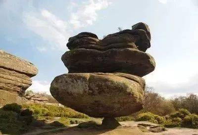 在英格兰北约克郡的伯明翰荒野方圆50公顷的领域,分布着许多这样形状奇特姿势也奇特的平衡石,其中最突出的一个被叫做偶像石。这块估计有200吨重的巨石把它硕大的身躯安置在一块与它相比非常袖珍的、锥形的小石头上,无法想象它们的接触点上承受着多大的压强。