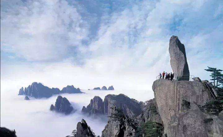 《红楼梦》的片头就是取景于“飞来石”。位于黄山天平矸西端的峰头上,巨石高十二米,重365吨。正好应和了一年12个月365天,所以又传“飞来石”飞来石高12米,宽8米,厚1.5至2.5米,重约360吨,形态奇特,如此巨石却被竖立在一块长约12-15米,宽8-10米的平坦岩石上,令人惊叹不已!游人站在平台边缘上凭栏揽胜,对面的双剪峰、双笋峰就象一幅神奇的泼墨山水画。地质学家认为,飞来石这一奇观是地质变化过程中形成的,真可谓天设地造。