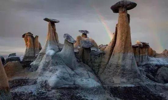 咋一看,这不就是蘑菇么?再仔细一瞧后面的彩虹,OMG,这真的是石头啊!它就是那被称为Hoodoos的蘑菇石柱,高高地立在荒芜的沙漠中。