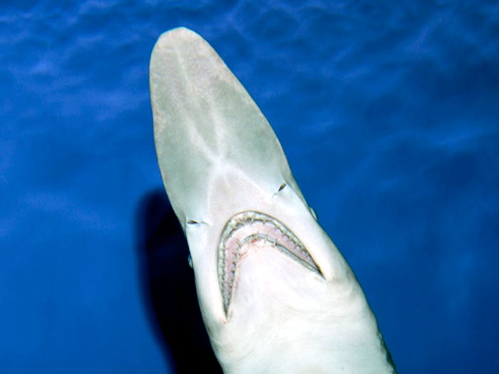 地精鲨鱼张开嘴巴迎接猎物 这类鲨鱼主要在日本沿海发现,根据《国家地理》杂志的报道,它们的下巴最有名,它们可以伸出几英寸才能抓到食物。