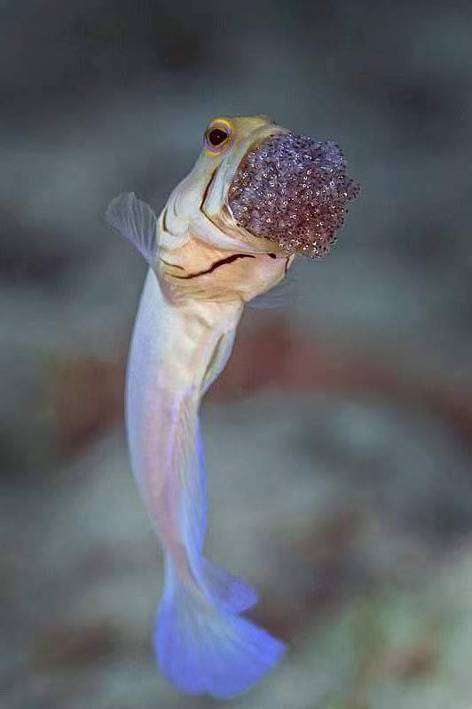 把鱼卵含在嘴里孵化的黄头后颌鱼。 海洋中的鱼类大部分还是进行体外受精的,并且基本上雌鱼和雄鱼都是直接把精子和卵产出来,在水里面受精完了就丢在原地不管,可以说是相当不负责任了。 不过黄头后颌鱼里的雄鱼就是其中的另类,它可以说为了后代是尽心尽力。 后颌鱼是一种“口育鱼”,字面意义就是它们会用自己的大嘴去孵化受精卵。 雌性的黄头后颌鱼在产卵后就直接走掉,而雄性的黄头后颌鱼会把精子排出来和卵结合和受精后,再逐一地把卵全部含进嘴中,然后就让这些受精卵在自己的嘴里慢慢孵化。