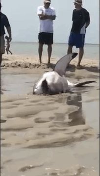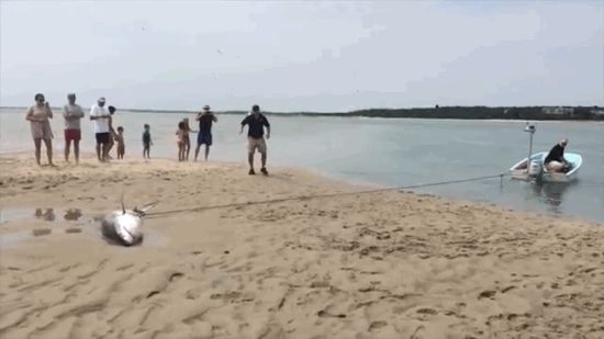 搁浅在海滩上的不断挣扎的大白鲨(网页截图) 据美国Buzzfeed网站7月15日报道,周一,一群游客在美国马萨诸塞州的查塔姆群岛的科德角海滩上发现了一只搁浅的身长超过两米的大白鲨,好心的游客们不顾危险给挣扎在海滩上的大白鲨浇海水,并配合救援人员一起把大白鲨送回大海。 据悉,游客们在周一下午13:30分向有关部门报告求救大白鲨,闻讯赶来的科德角海滩港务长斯图尔特·史密斯(Stuart Smith)分析称这只大白鲨很可能是在退潮前想要捕食海滩上的海鸥,而被搁浅于此。他说自己在海滩工作了28年,这是他第一次解救大白鲨,一般都是解救海豚和鲸鱼。 插播:海滩遇见一条搁浅的大白鲨 斯图尔特等人在一桶桶的给大白鲨浇水斯图尔特和马萨诸塞州海军队员一起,不断地向逐渐失去生机的大白鲨一桶桶的浇海水,给它保湿。考虑到游客安全,斯图尔特和其它官员赶到后将游客隔离到一边。然后,解救人员用绳子将大白鲨的尾翼绑到一条小船上,将它拖回距离海岸1.6公里的安全海域里。