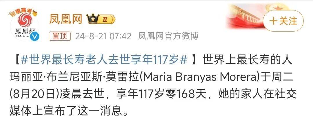 117岁世界最长寿老人去世冲上热搜,养生秘诀曝光:饮食第三,睡觉第二,第一很多人做不到 心气宽了,天地就宽了;心态好了,身体就好了。 之前刷到一则新闻, 享有“世界在世最长寿老人”之称的老人玛丽亚·布兰亚斯·莫雷拉于8月20日去世,享年117岁168天。