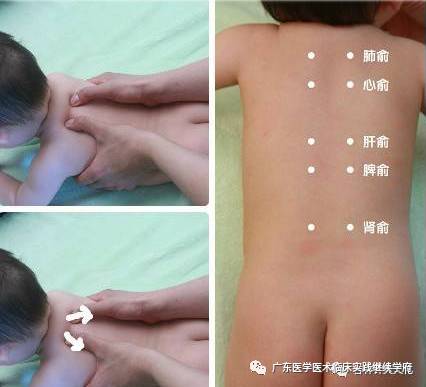 小儿推拿是手法施与小儿,刺激穴位和经络,调节经气、阴阳、精气神,通过激活和调动小儿机体,由机体自身而不是药物去改善体内状态,达到脏腑间的阴阳平衡和人与自然的和谐。 1、补脾经,常用于消化系统疾病,在呼吸道感染后也会补脾养肺,培土生金。 2、顺运八卦,脾胃系统疾病和呼吸系统疾病都可以用。 3、掐五指节,宝宝受到惊吓之后的常用手法。 4、揉涌泉,头痛发热,呕吐腹泻,补益肾气。 5、捣小天心,清热镇惊,用于惊风、抽搐、烦躁不安。 6、平肝清肺,用于呼吸道外感。 7、顺时针摩腹,用于便秘,积食,内热。 8、拿风池,用于感冒发汗、头痛、发热。 9、推六腑,用于高热、凉血、解毒。 10、捏挤大椎,用于感冒、发热。 11、分手阴阳,用于调节阴阳平衡,寒热夹杂,半表半里,高热不退。 12、清大肠,用于便秘、积食。 13、掐四缝穴,用于厌食、积食。 14、揉肺俞,用于肺炎、咳嗽。 15、下推七节骨,用于便秘、积食。 16、拿肩井,用于感冒、惊风。 17、分腹阴阳,用于腹泻、积食、便秘等消化系统疾病 18、横擦四横纹(或者叫小横纹),用于干咳轻咳、咳嗽初起或咳嗽将愈。 19、揉板门,板门为脾胃之门,可以通三焦,清虚热实热,治上吐下泻、脘腹痛。 20、揉足三里,用于脾胃疾病,常敲足三里,胜吃老母鸡,足三里为脾胃保健穴。 21、清天河水,用于低烧,心经有热。 中医小儿推拿,日常小病不用愁! 当宝宝出现身体不适的时候,爸比妈咪不用担心哦。此时完全可以通过一些简单的小儿推拿手法,为宝宝排解不适。下面,小编就来给大家推荐几招简单、易操作的小儿推拿手法! 萌爸辣妈们,赶快学习去吧! 【肺俞】 [位置] 在第3胸椎棘突下缘(第3胸椎与第4胸椎间)旁开1.5寸,属足太阳膀胱经。 [操作] 用两拇指或用示、中二指揉两侧肺俞,称揉肺俞;用两拇指分别自肩胛骨内缘从上向下推动100次,称分推肺俞,或称分推肩胛骨。 [功用] 益肺理气,止咳化痰。 [主治] 发热,咳喘以及一切呼吸道疾患 【脊柱】 [位置] 自大椎至长强呈一直线。 [操作] 自上而下作直推,称推脊;用捏法自下而上称为捏脊。捏3~5遍,每捏3下再将背脊皮提1下,称为捏三提一法。 [功用] 调阴阳、理气血、和脏腑、通经络、培元气,具有强健身体的功能。 [主治] 发热、惊风、夜啼、疳积、腹泻、呕吐、腹痛、便秘等 【天枢】 [位置]肚脐旁2寸(约一指)的地方,左右各一个。 [操作]用食指和中指分别点按在两侧的天枢穴,轻轻的按揉,揉50~100次。 [功用]天枢为大肠之募穴,能疏导大肠,理气消滞。临床上常用治疗消化系统疾患。 [主治]腹泻、腹胀、腹痛、便秘,消化功能紊乱 【腹阴阳】 [别名] 腹。 [位置] 在中脘穴与两胁下之软肉处。 [操作]沿肋弓角边缘或自中脘至脐,向两旁分推,称分推腹阴阳、分腹阴阳;掌或四指摩称摩腹。 [功用] 健脾和胃,理气消食。 [主治] 腹痛,腹胀,肠鸣等消化系统疾患。顺时针摩腹可通便,逆时针摩腹可止泻 【膻中】 [位置] 在胸骨上,两乳头连线之中央,属任脉 [操作] 中指端揉称揉膻中;两拇指自穴中向两旁分椎至乳头名分推膻中 [功用] 膻中为气之会穴,居胸中,推揉膻中能宽胸理气,止咳化痰。 [ 主治] 各种原因引起的胸闷,呕吐,气逆,咳喘,痰鸣等症 【退六腑】 [位置] 在前臂尺侧,自肘关节至腕横纹呈一条直线。 [操作]用拇指面或示、中指面自肘推向腕,称退六腑或推六腑。 [功用] 清热,凉血,解毒。 [主治] 一切热证。高热,口渴,惊风,咽痛,鹅口疮(口腔舌上满布白色糜点,形如鹅口),腮腺炎,大便干燥等。 【一窝风】 [别名] 外一窝风。 [位置] 在手腕背侧,腕横纹中央。 [操作] 指端揉,称揉一窝风。 [功用] 揉一窝风能温中行气,止痹痛,利关节。 [主治] 一切腹痛,伤风感冒,关节痹痛,急慢惊风 【内劳宫】 [位置]在掌心中央,握拳屈指时中指、无名指所指处中间,即是劳宫穴。 [操作]用中指揉,称揉劳宫。揉100-200次。 [功用]左揉发汗,右揉泻心火,除烦躁。 [主治]发热、烦渴、目疮、齿龈糜烂、虚烦内热等 【端正】 [位置] 在中指甲根两侧赤白肉处,桡侧称左端正,尺侧称右端正。 [操作] 用拇指甲掐或拇指罗纹面揉称掐、揉端正。 [功用] 掐右端正治呕吐及鼻出血;掐左端正有升提作用,主要用于水泻,痢疾等症。 [主治] 鼻出血,惊风,呕吐,泄泻,痢疾 【老龙】 [位置]在中指指甲根正中下一分。 [操作]拇指甲掐,称掐老龙。 [功用]开窍醒神,退热。 [主治] 突然昏厥,虚脱气闭,心火实热,急惊风 【小天心】 [别名] 鱼际交。 [位置] 在大小鱼际交接处凹陷中。 [操作] 用指端揉,称揉小天心;拇指甲掐,称掐小天心;以中指尖或屈曲的指间关节捣,称捣小天心 [功用] 揉能清热镇惊,利尿,明目;掐捣能安神镇惊。 [主治] 惊风,抽搐,烦躁不安,夜啼,小便赤涩,目赤肿痛,痘疹欲出不透等 【手阴阳】 [位置]掌侧腕横纹。又称大横纹。桡侧(拇指侧)为阳池,尺侧(小指侧)为阴池。 [操作]两拇指自掌侧腕横纹中央(总筋穴)向两旁分推,称分推大横纹,又称分手阴阳、分阴阳。 [功用]平衡阴阳,调和气血,行滞消食。 [主治]寒热往来,腹胀、腹泻、呕吐、食积、烦躁不安 【板门】 [位置]手掌面大鱼际平面。 [操作]用拇指按揉板门称为揉板门,顺时针、逆时针都可以。从腕横纹推向拇指根称为横纹推向板门,可以止吐。反之,称为板门推向横纹,可以止泻。 [功用]健脾和胃,消食导滞。治疗乳食停滞,食欲不振。 [主治]食积