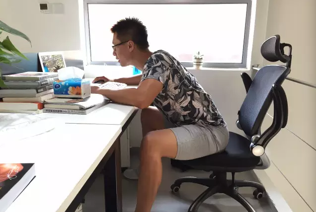 这种坐姿会让大腿根部髂腰肌紧张,加剧骨盆前倾。近视的同学,如果眼镜的度数不对,身体是会本能前倾靠近屏幕的,这时候你就该换眼镜啦! 错误 2:跑车式坐姿